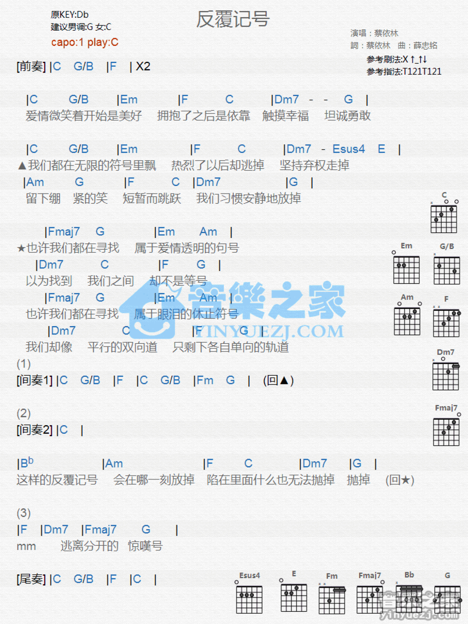 反复记号吉他谱 - 蔡依林 - C调吉他弹唱谱 - 和弦谱