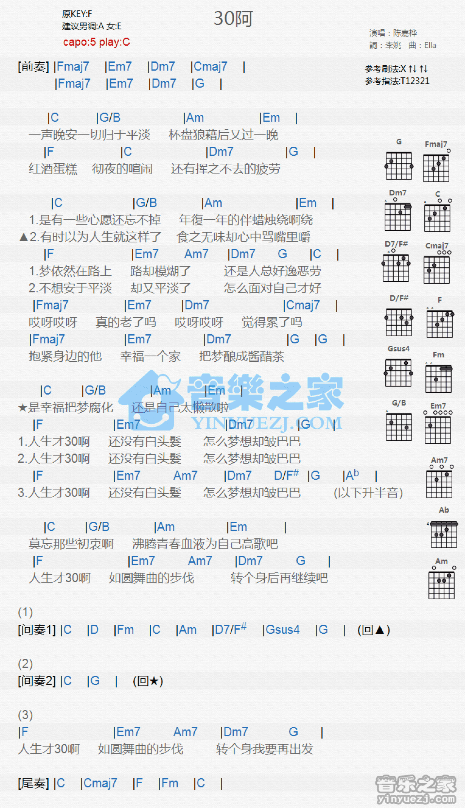 曲谱介绍: C调版陈嘉桦《30啊》吉他和弦弹唱谱