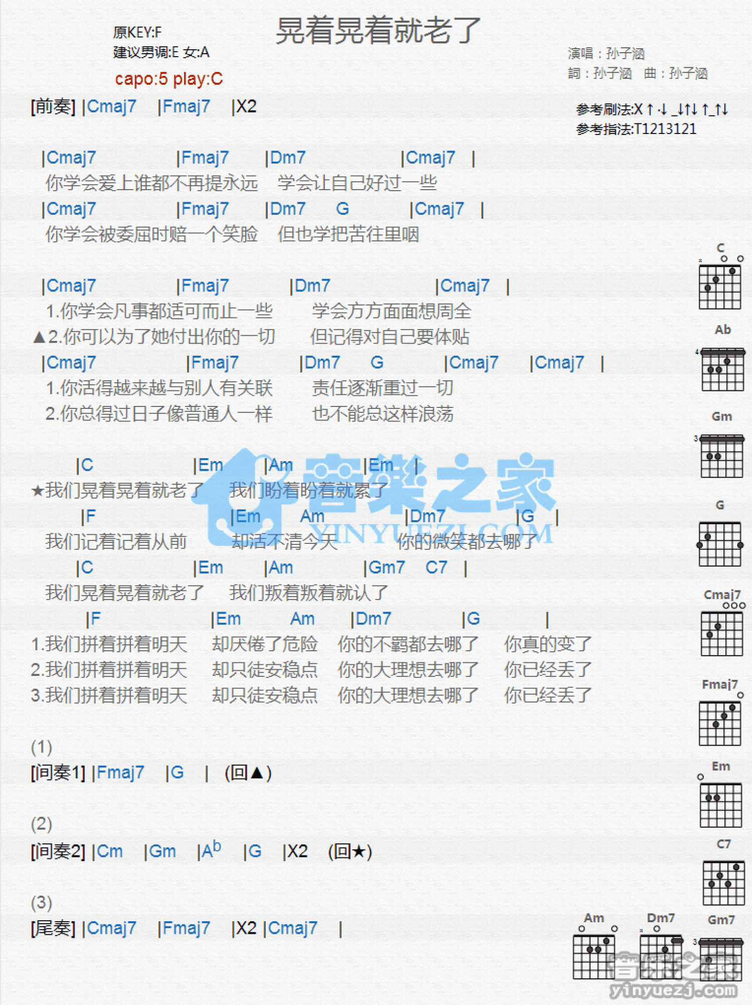 曲谱介绍: C调版 孙子涵《晃着晃着就老了》吉他和弦弹唱谱