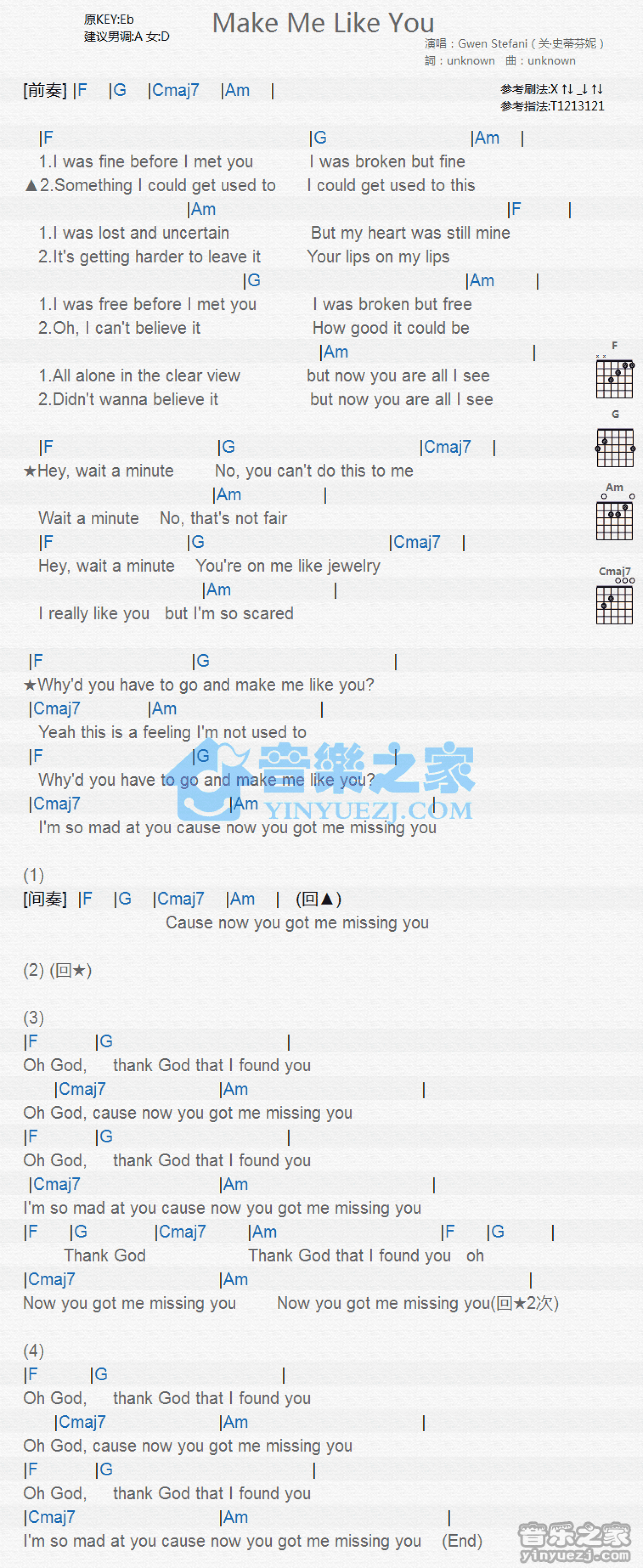 曲谱介绍: D调版 Gwen Stefani《Make Me Like You》吉他和弦弹唱谱