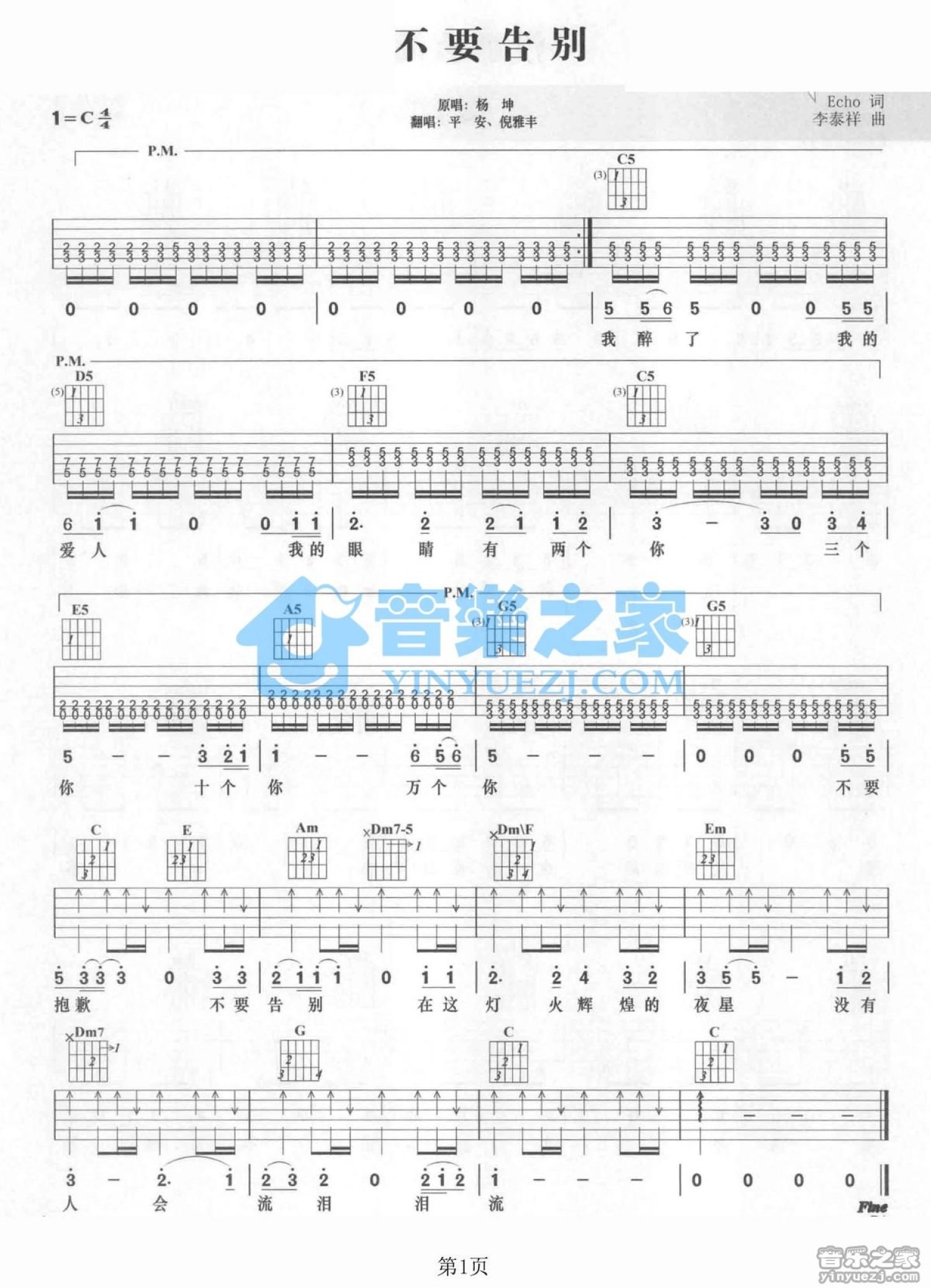不要告别吉他谱 - 平安/倪雅丰 - C调吉他弹唱谱