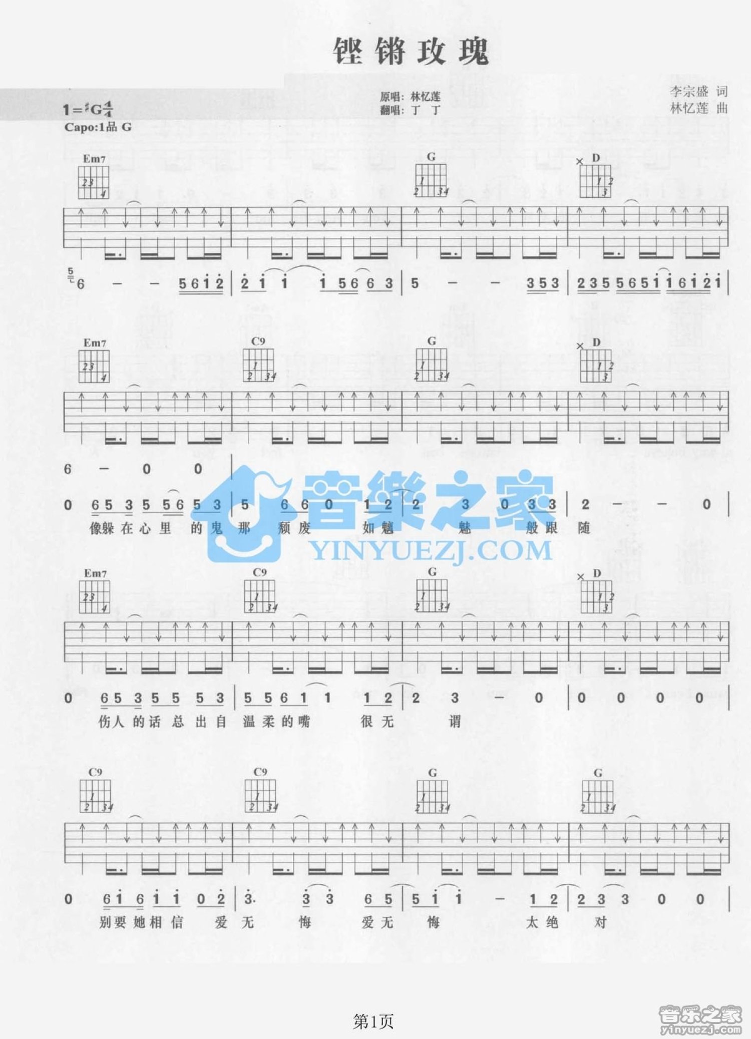 曲谱介绍: 好声音G调版 丁丁《铿锵玫瑰》吉他弹唱六线谱