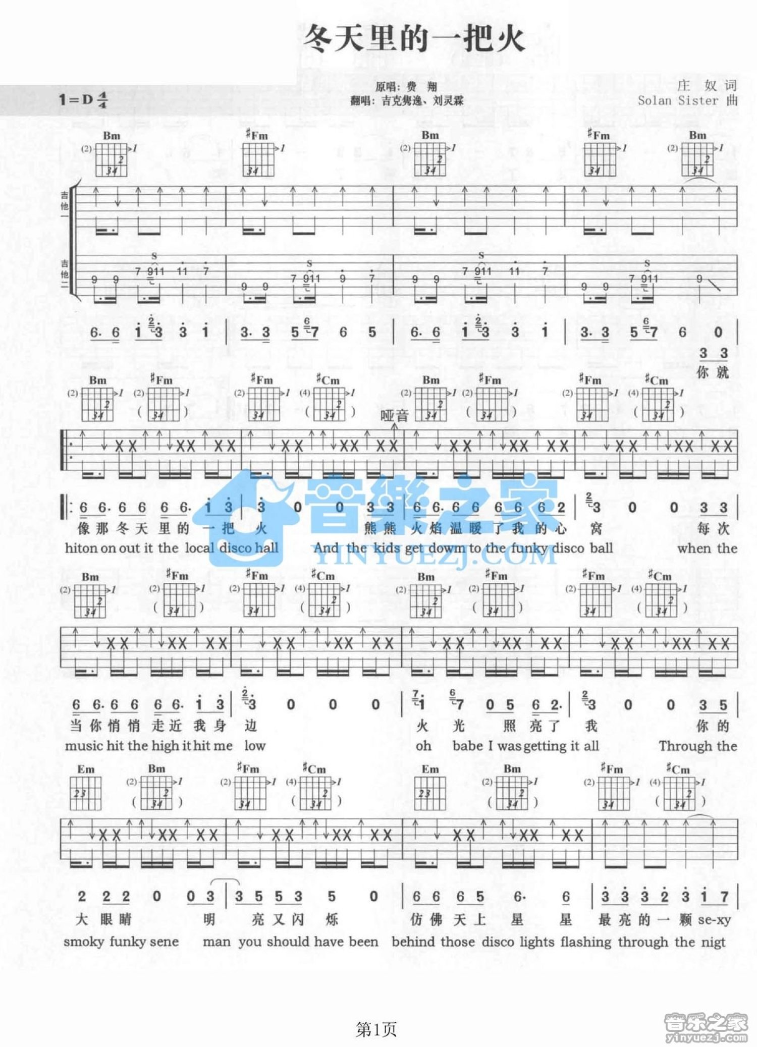 曲谱介绍: 好声音D调吉《冬天里的一把火》吉他弹唱六线谱