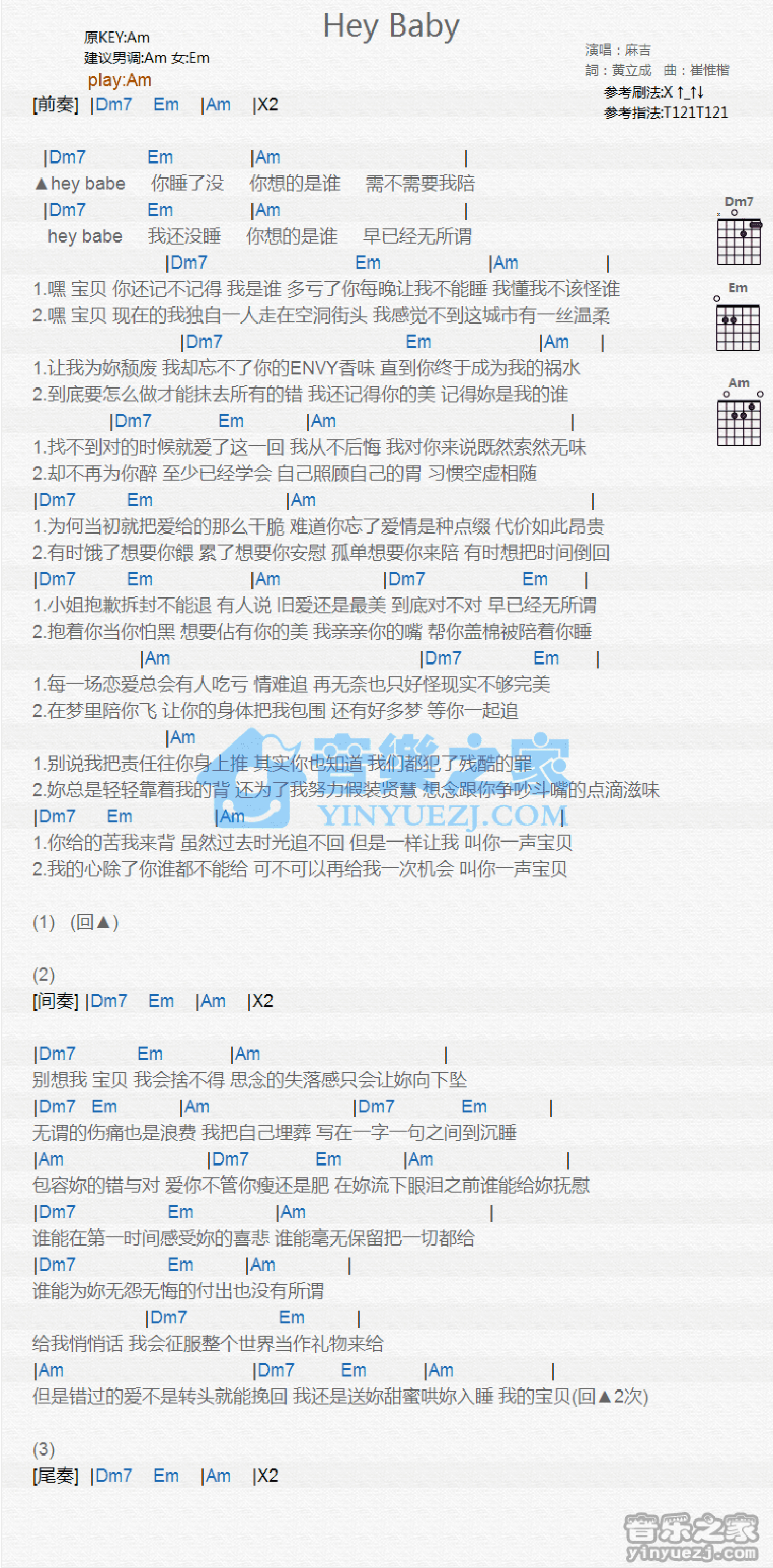 曲谱介绍: Am调版 麻吉《Hey Baby》吉他和弦弹唱谱