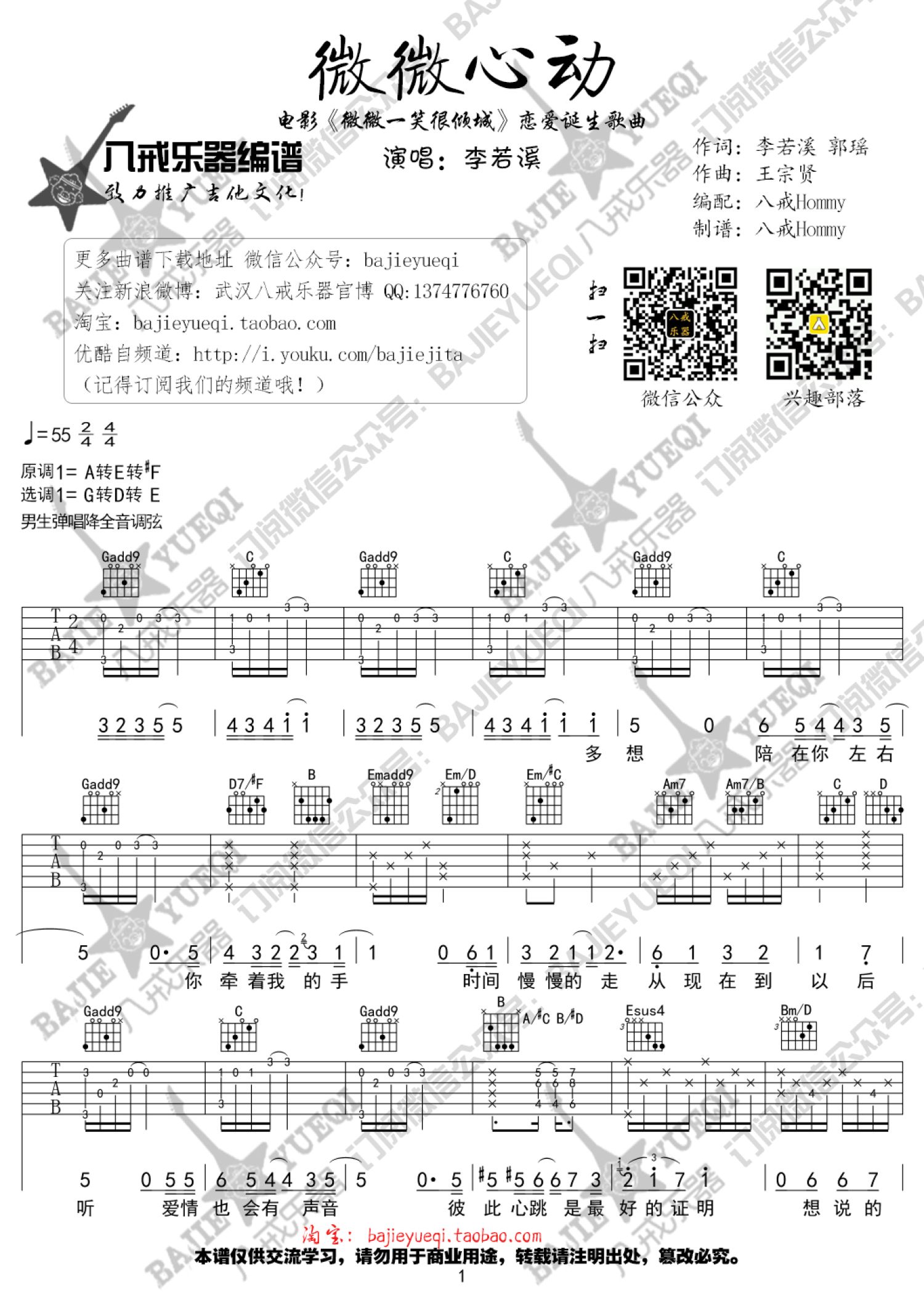 曲谱介绍: 八戒G调版 李若溪《微微心动》吉他弹唱六线谱