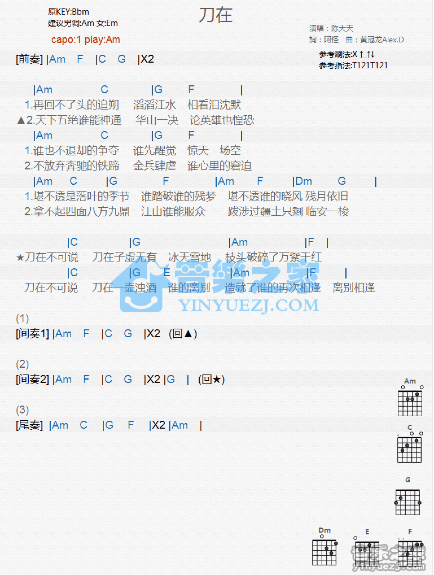 曲谱介绍: Am调版 陈大天《刀在》吉他和弦弹唱谱