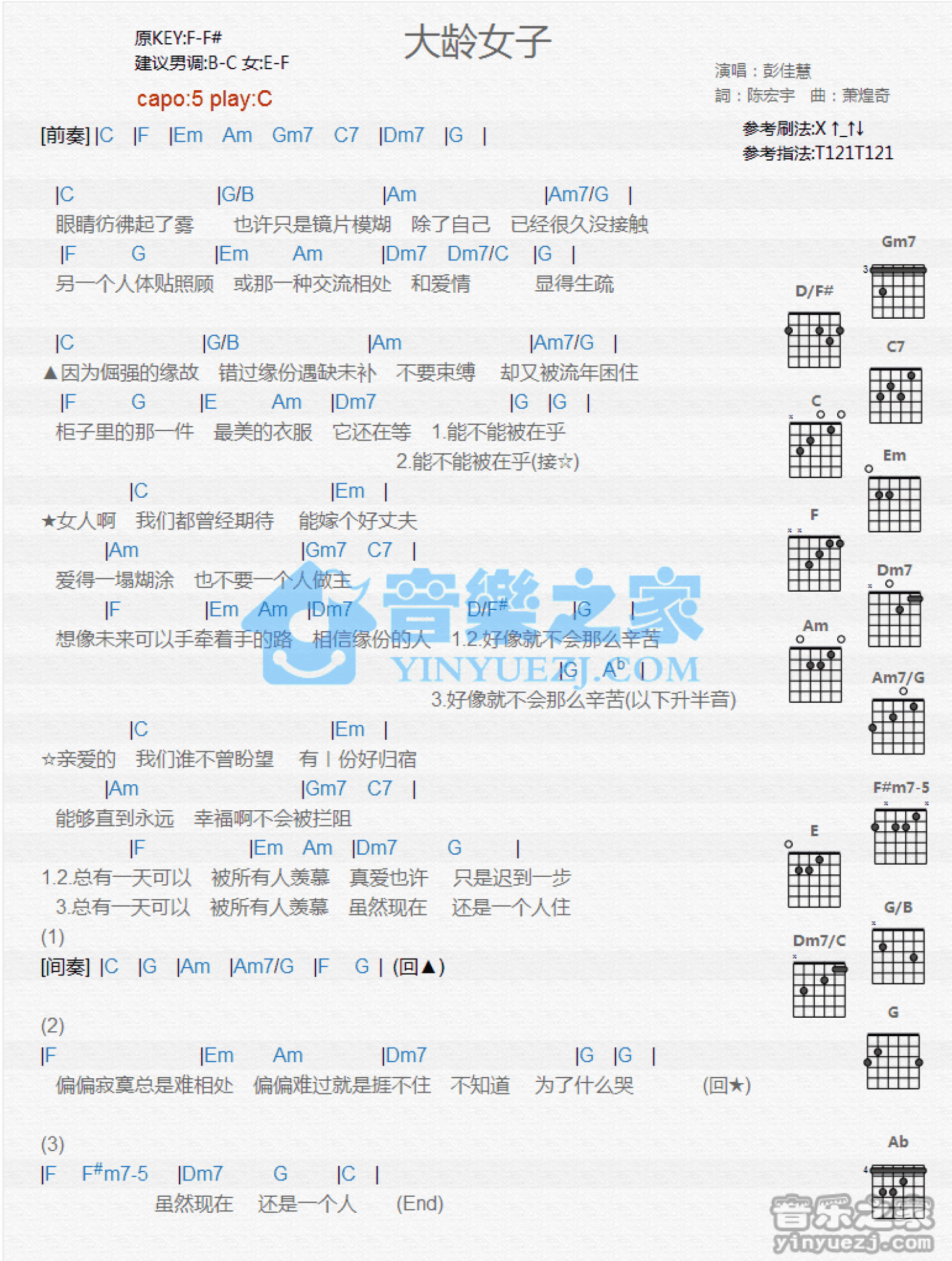 曲谱介绍: C调版 彭佳慧《大龄女子》吉他和弦弹唱谱