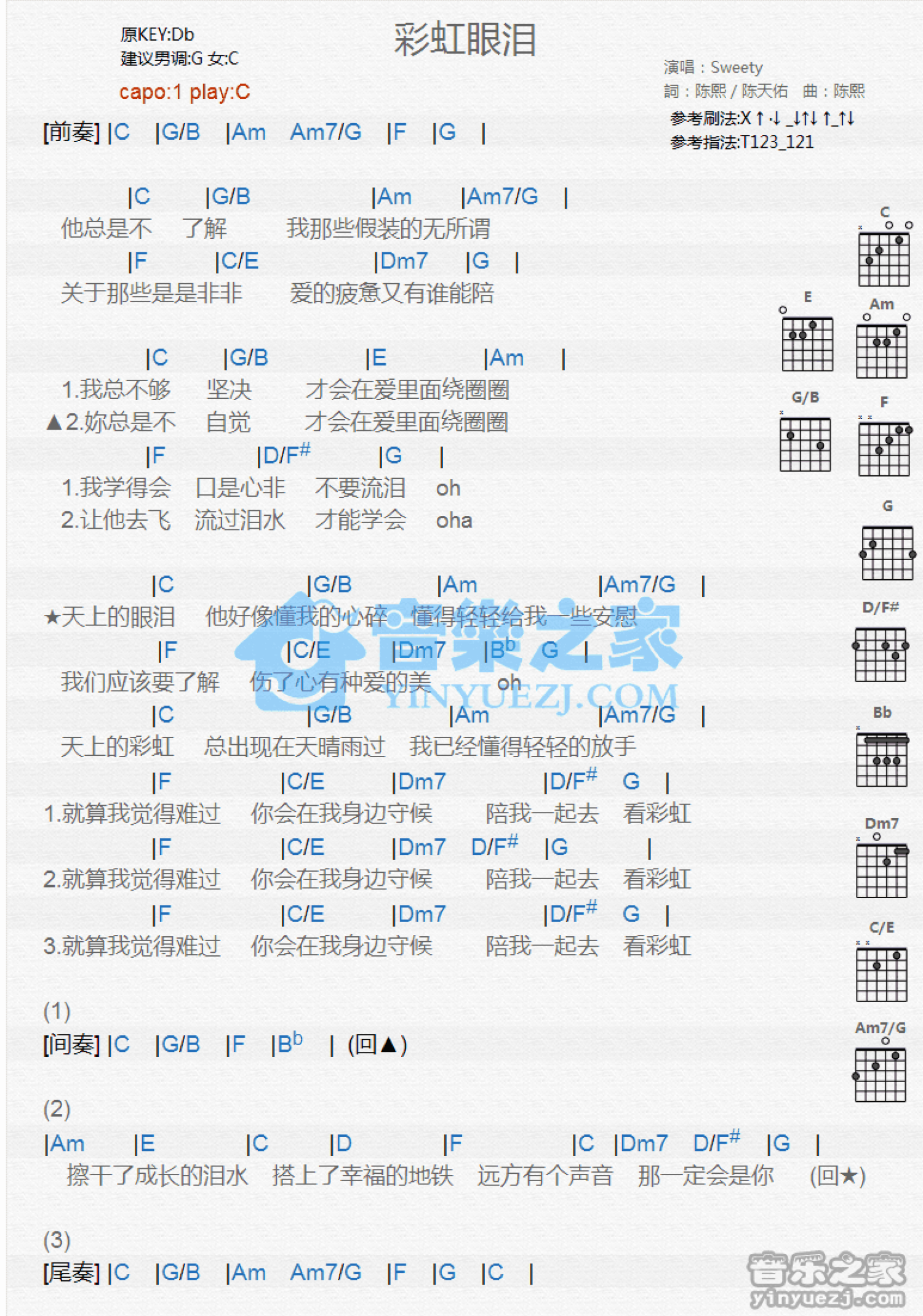 曲谱介绍: C调版 Sweety《彩虹眼泪》吉他和弦弹唱谱