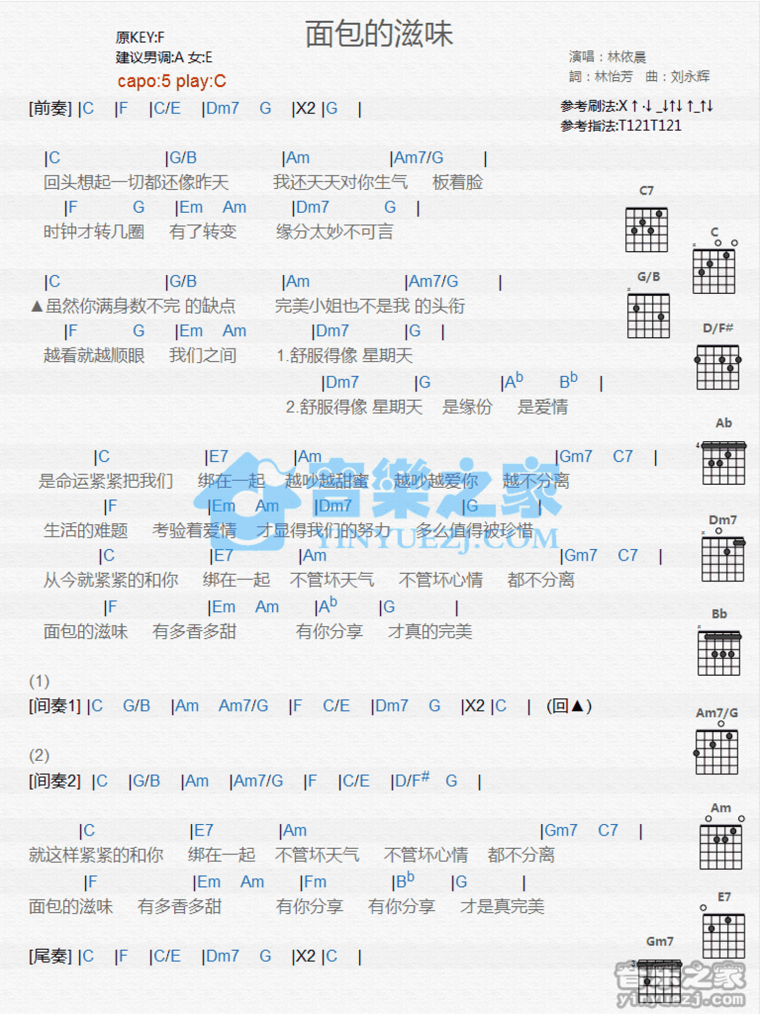 曲谱介绍: C调版 林依晨《面包的滋味》吉他和弦弹唱谱