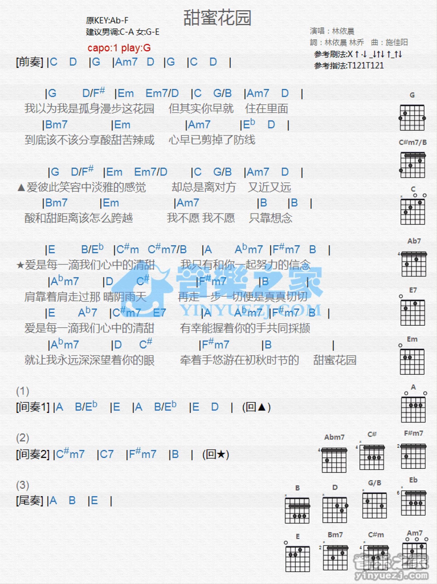 曲谱介绍: G调版 林依晨《甜蜜花园》吉他和弦弹唱谱