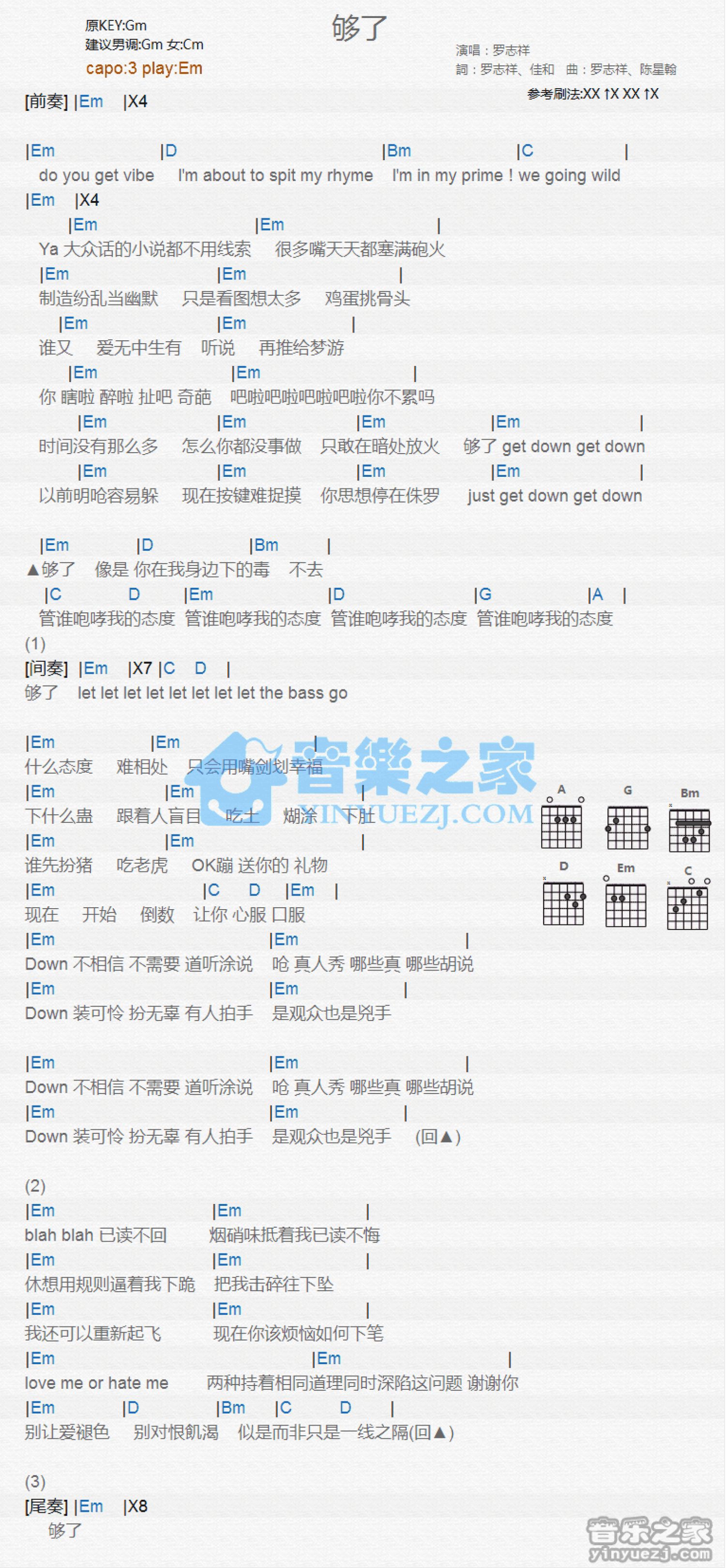 曲谱介绍: Em调版 罗志祥《够了》吉他和弦弹唱谱