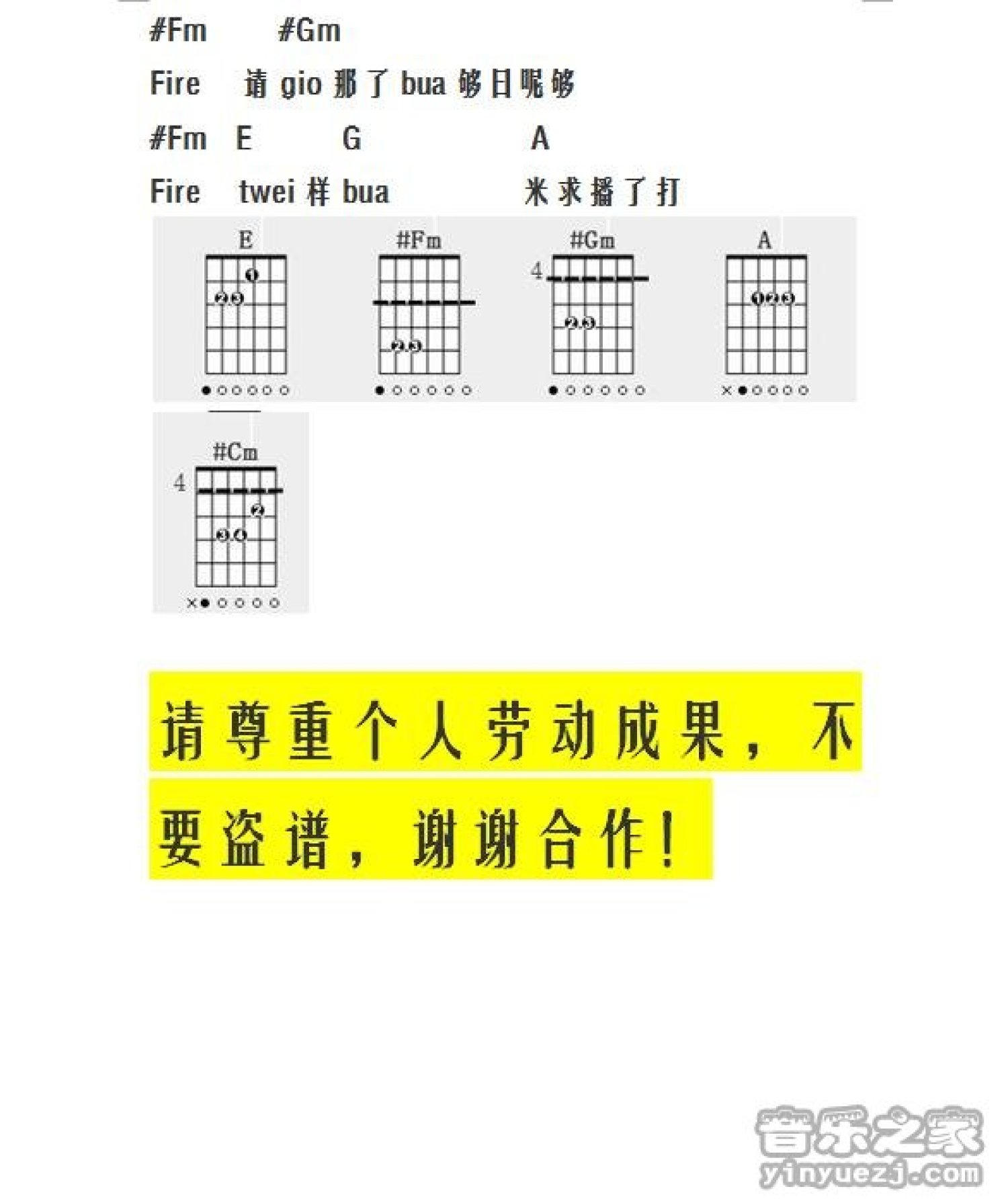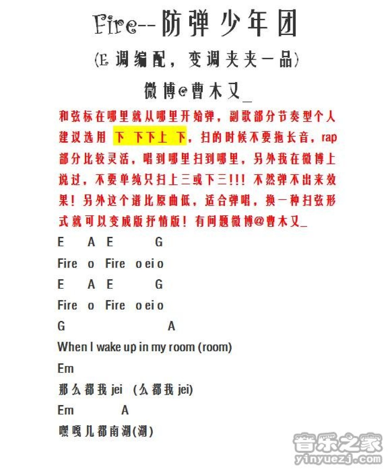 曲谱介绍: E调简单版 防弹少年团《Fire》吉他和弦弹唱谱