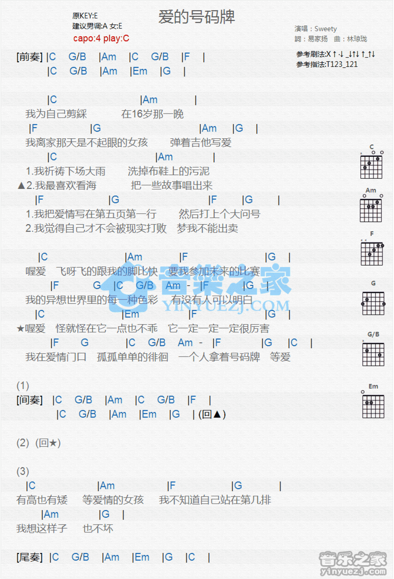 曲谱介绍: C调版 Sweety《爱的号码牌》吉他和弦弹唱谱