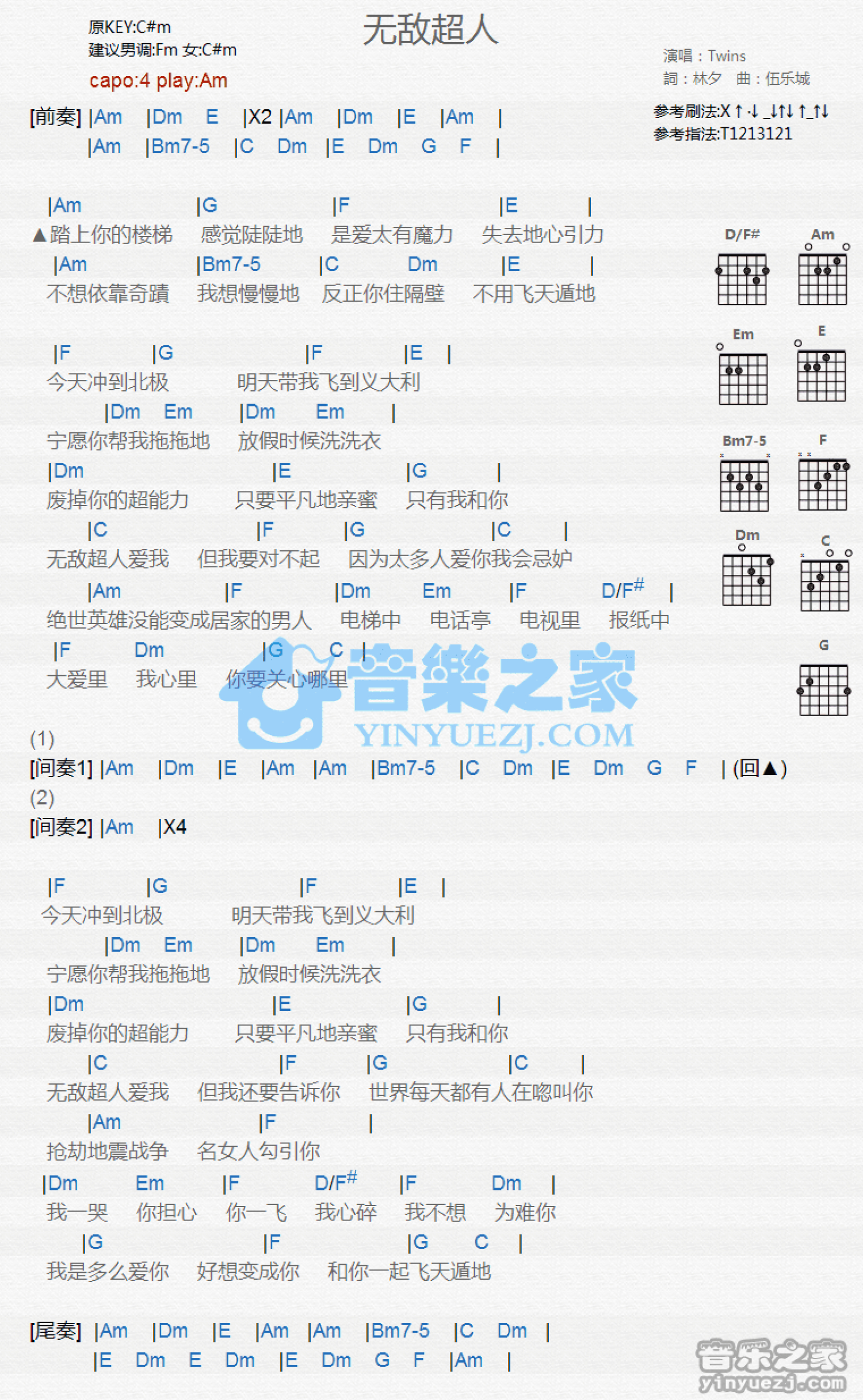 曲谱介绍: Am调版《无敌超人》吉他和弦弹唱谱
