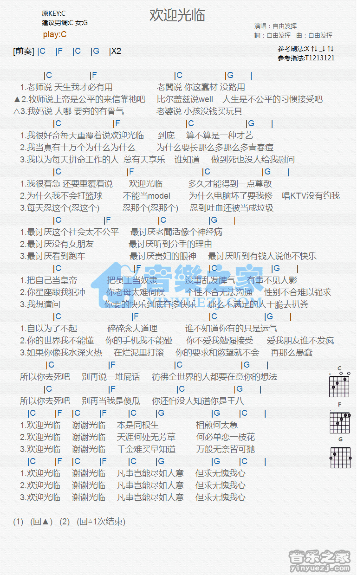 曲谱介绍: C调版 自由发挥《欢迎光临》吉他和弦弹唱谱
