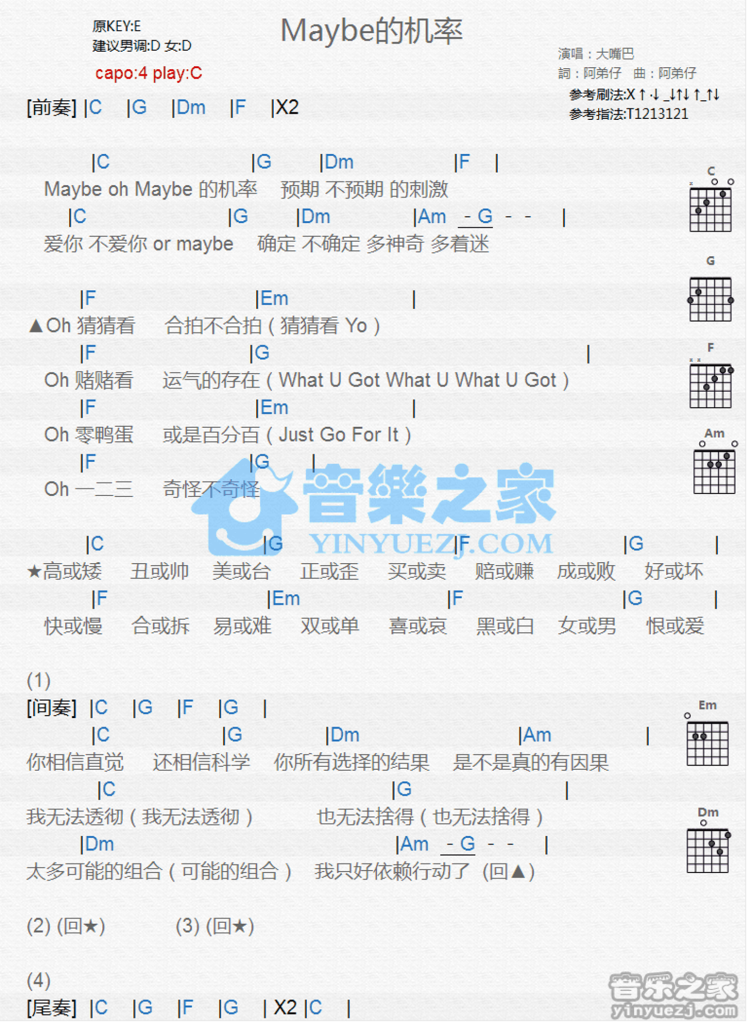 曲谱介绍: C调版 大嘴巴《Maybe的机率》吉他和弦弹唱谱