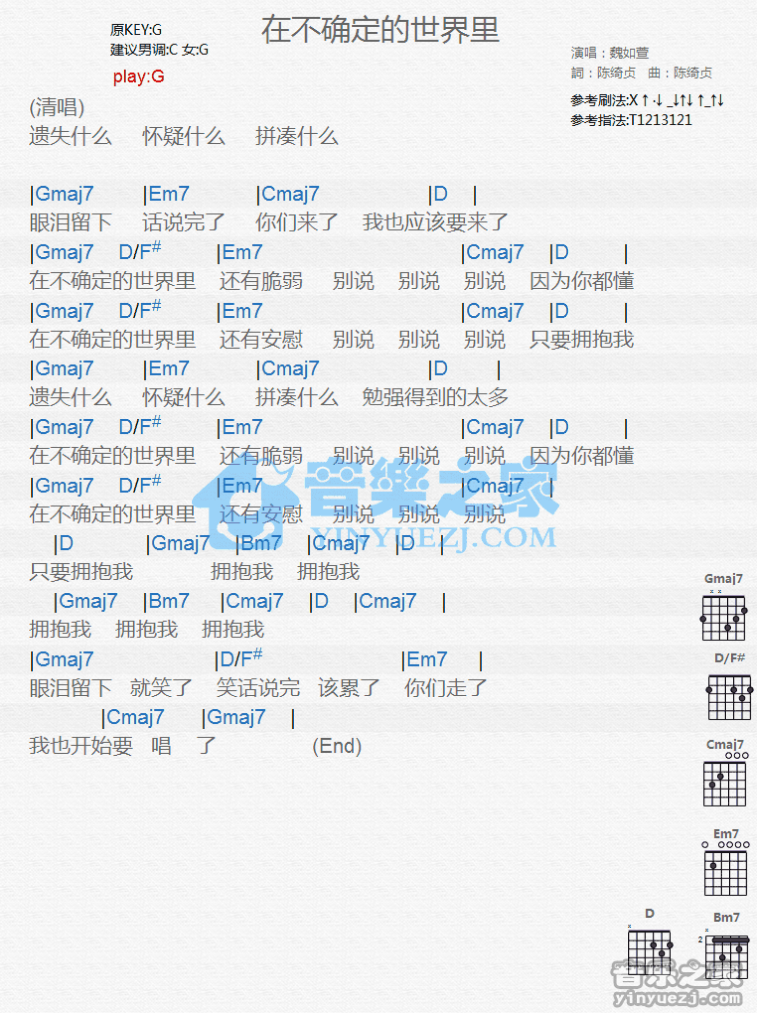 曲谱介绍: G调版 魏如萱《在不确定的世界里》吉他和弦弹唱谱