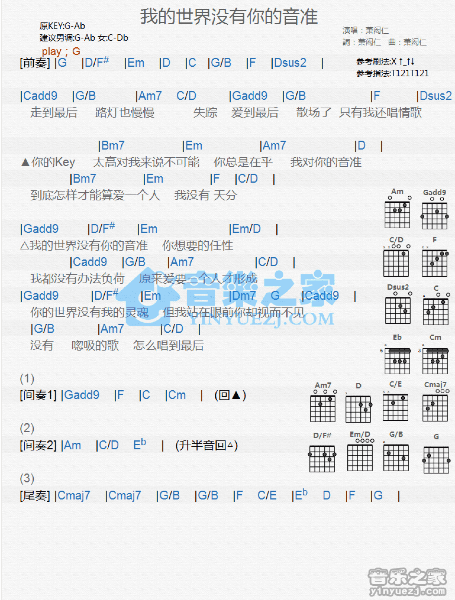 我的世界没有你的音准吉他谱 - 萧闳仁 - G调吉他弹唱谱 - 和弦谱
