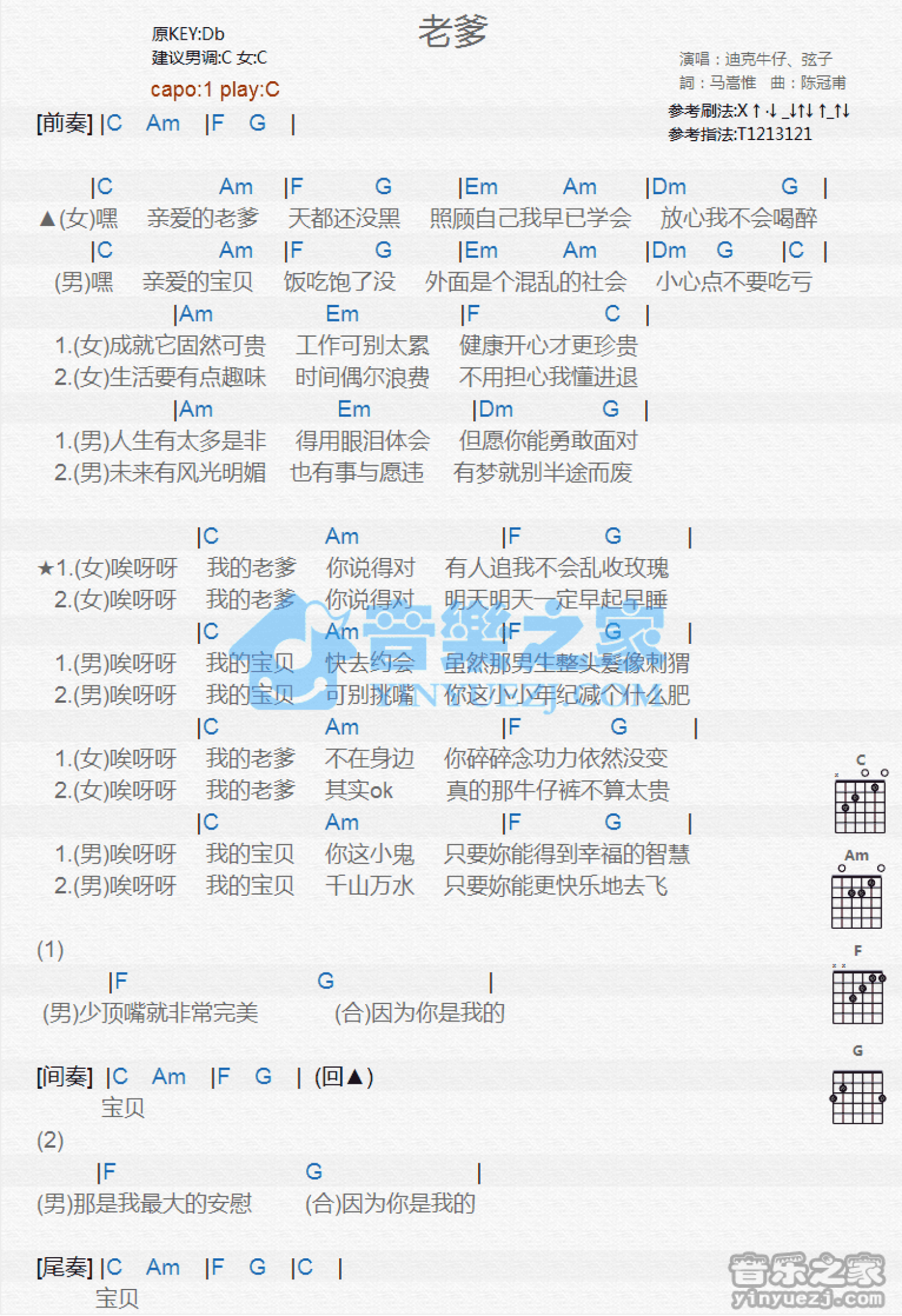 曲谱介绍: C调版《老爹》吉他和弦弹唱谱