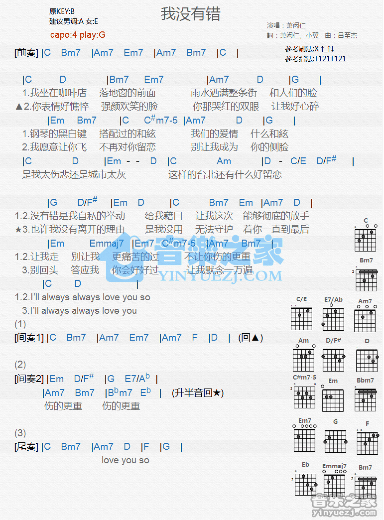 曲谱介绍: G调版 萧闳仁《我没有错》吉他和弦弹唱谱