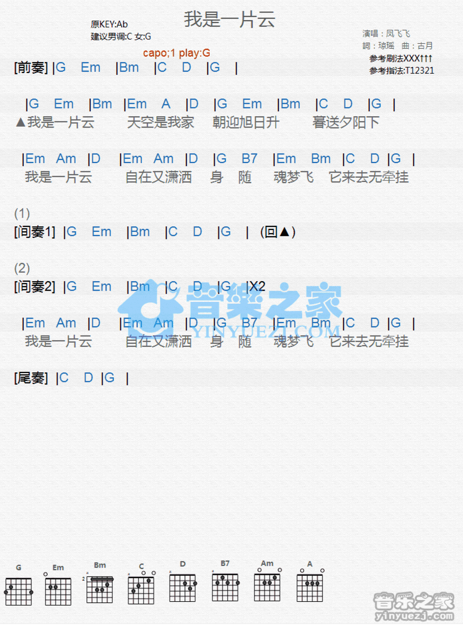 曲谱介绍: G调版凤飞飞《我是一片云》吉他和弦弹唱谱