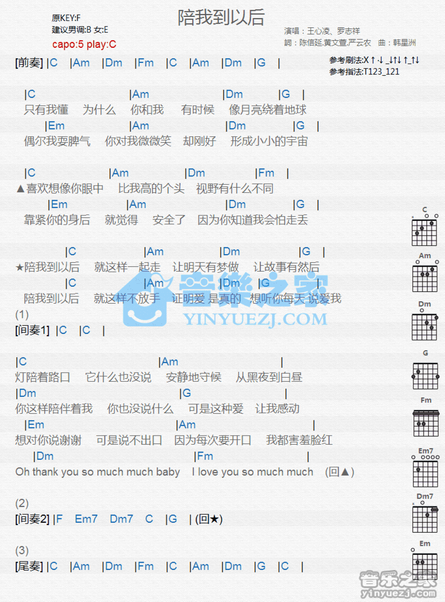 曲谱介绍: C调版 王心凌/罗志祥《陪我到以后》吉他和弦弹唱谱