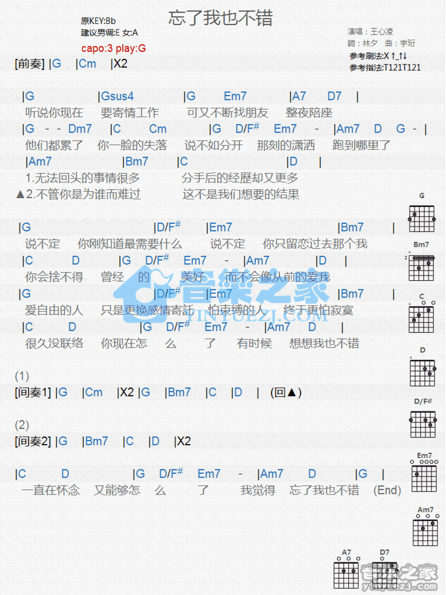 曲谱介绍: G调版 王心凌《忘了我也不错》吉他和弦弹唱谱
