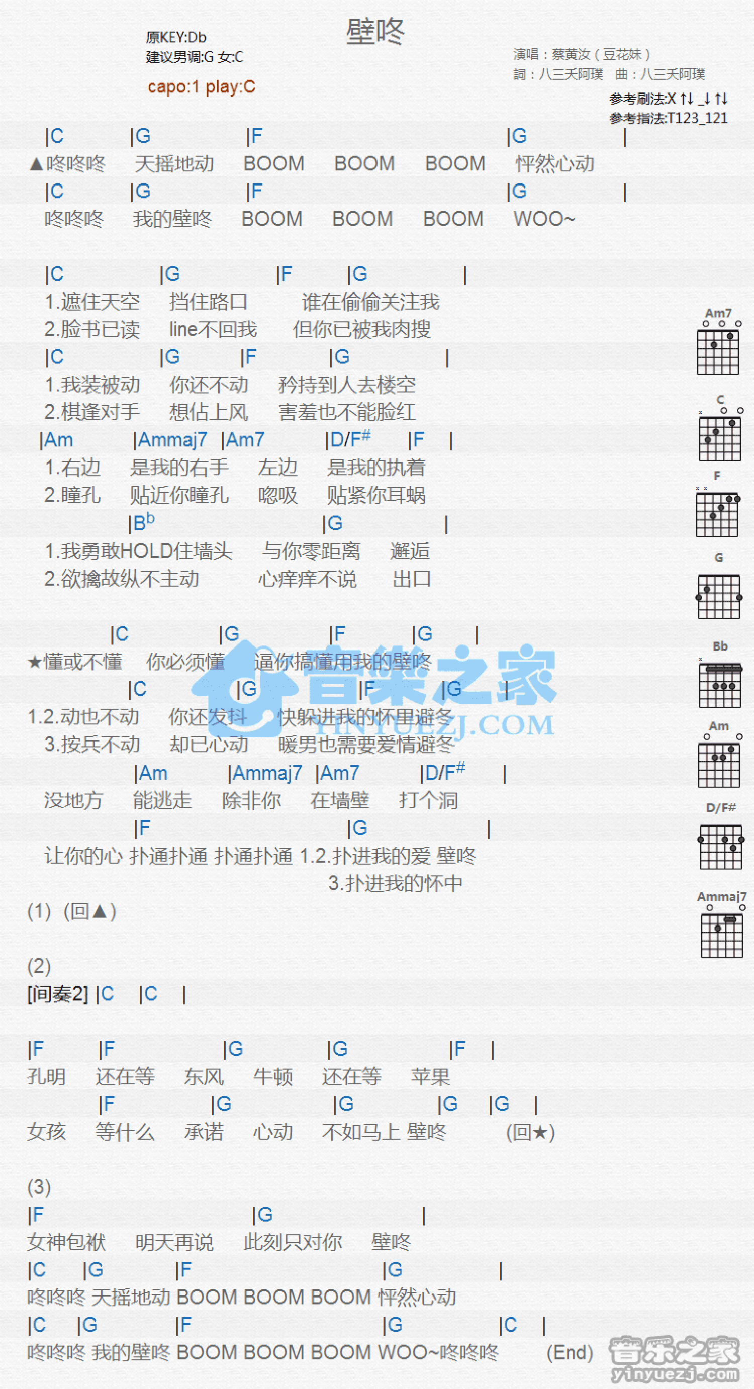 曲谱介绍: C调版 蔡黄汝《壁咚》吉他和弦弹唱谱