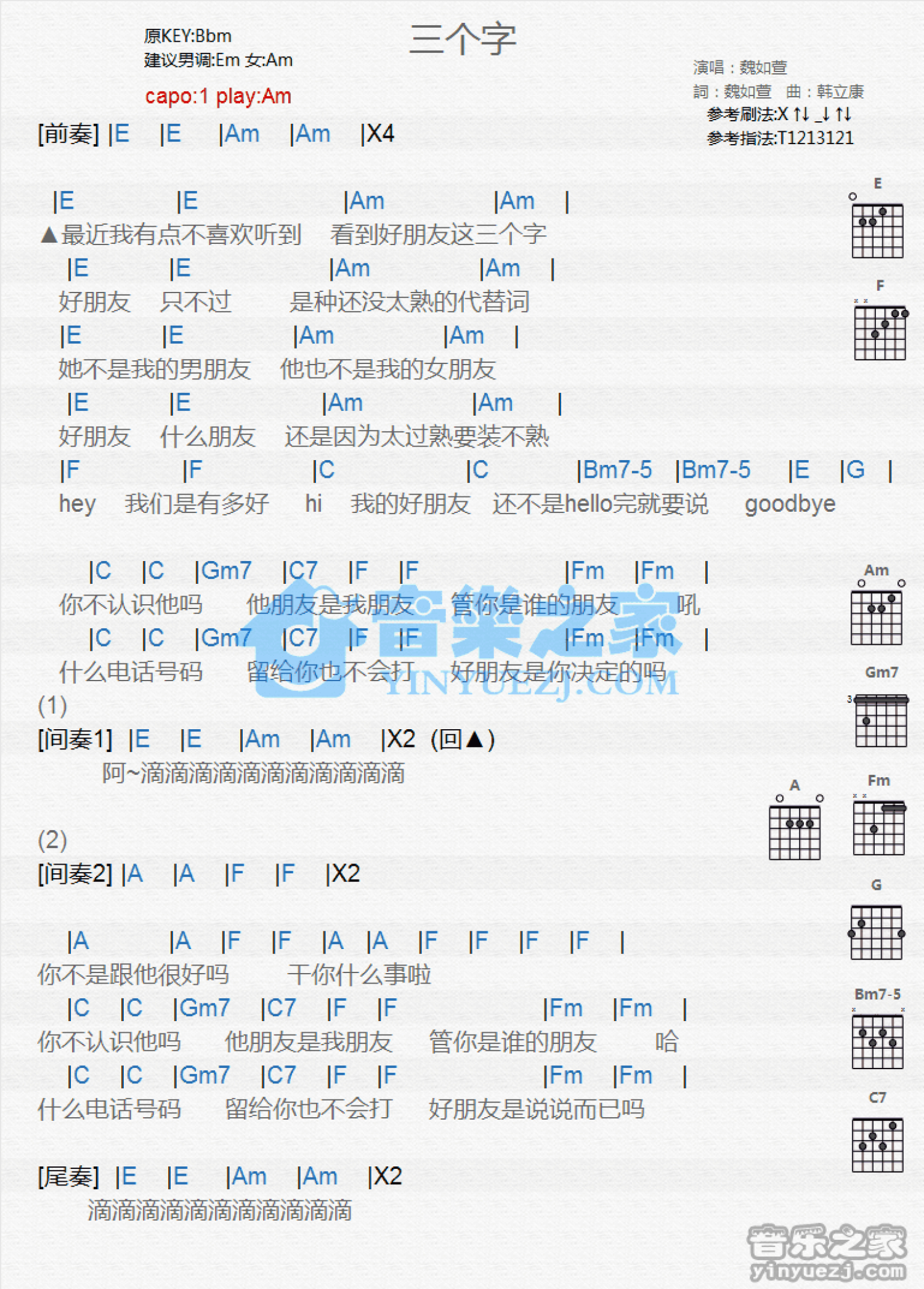曲谱介绍: Am调版魏如萱《三个字》吉他和弦弹唱谱