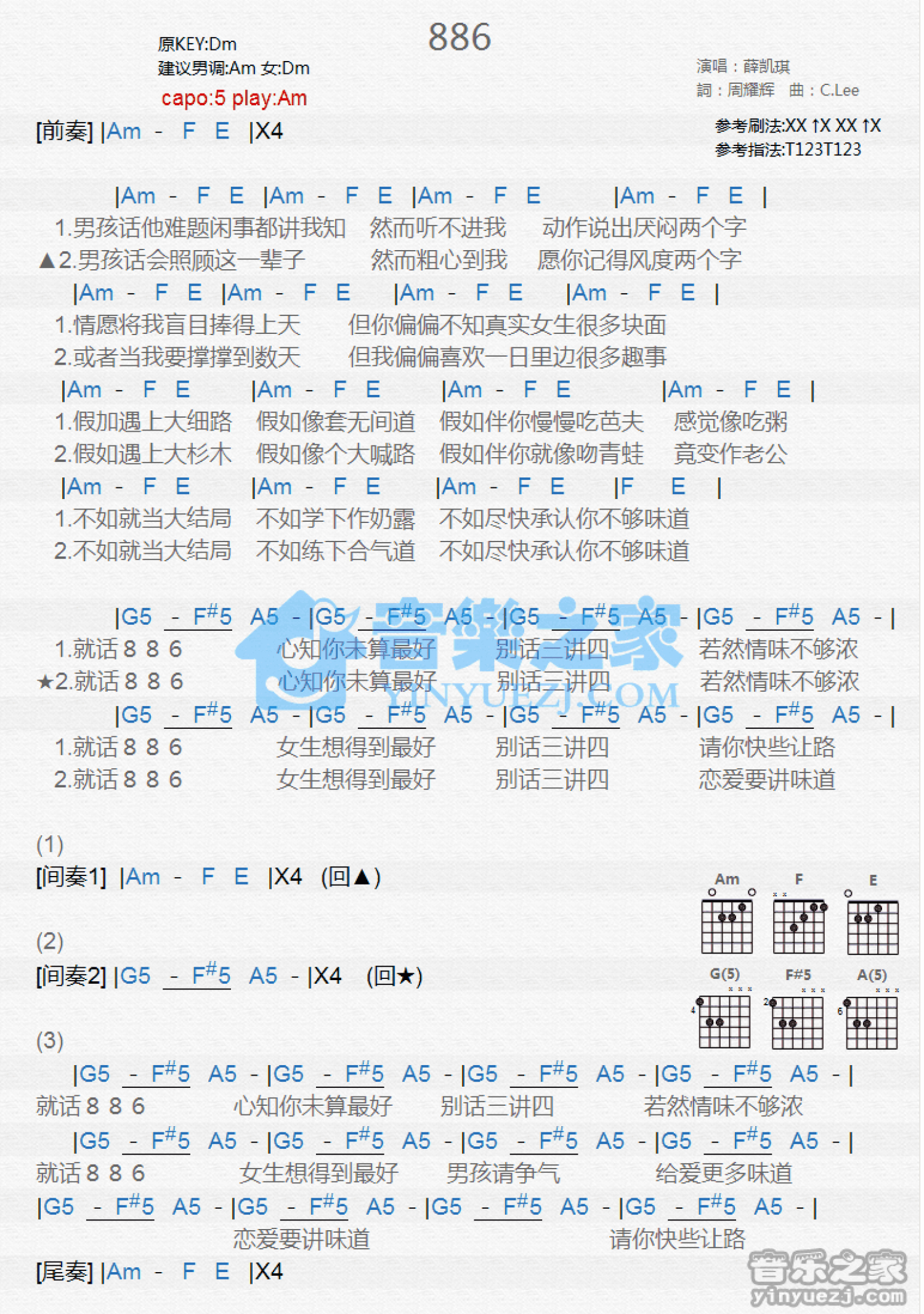 曲谱介绍: Am调版 薛凯琪《886》吉他和弦弹唱谱