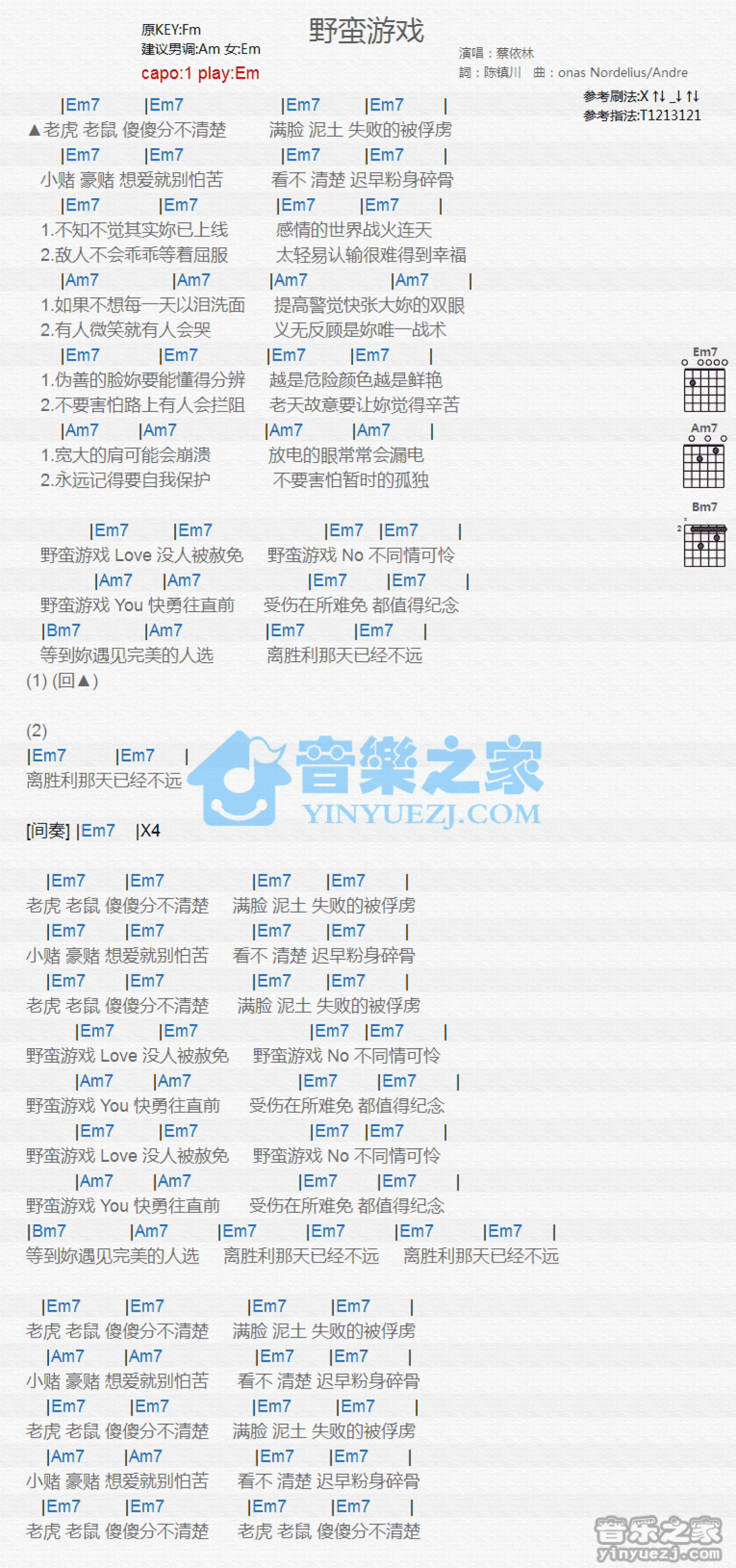 曲谱介绍: Em调版 蔡依林《野蛮游戏》吉他和弦弹唱谱