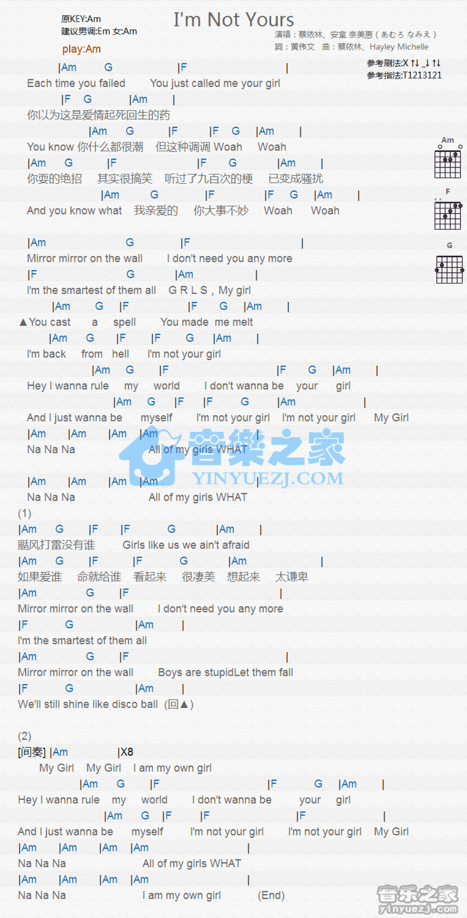 曲谱介绍: Am调版 蔡依林/安室奈美{《I'm Not Yours》吉他和弦弹唱谱