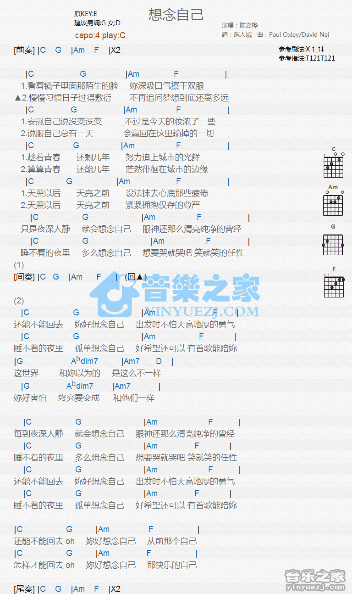 曲谱介绍: C调版 陈嘉桦《想念自己》吉他和弦弹唱谱