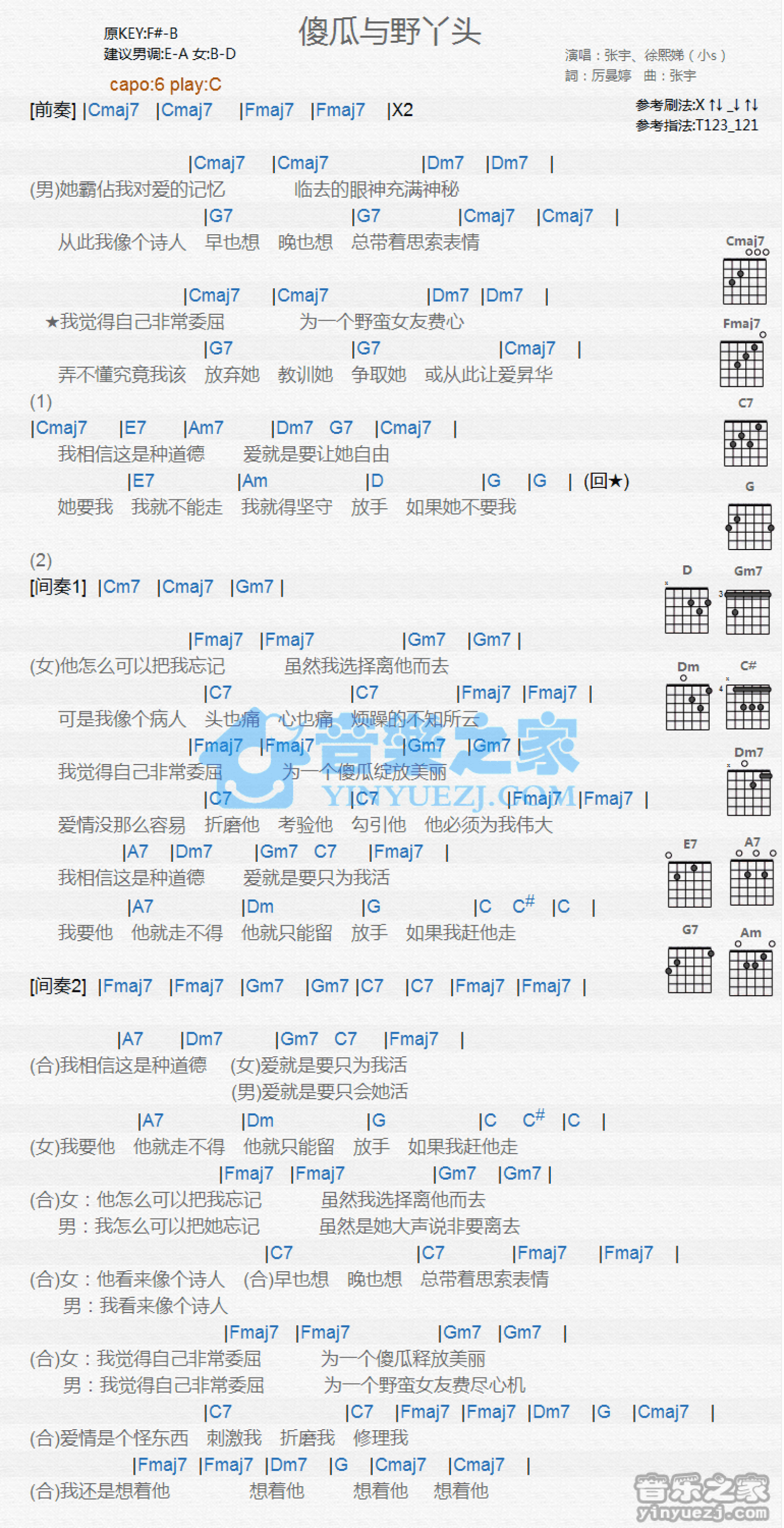 曲谱介绍: C调版《傻瓜与野丫头》吉他和弦弹唱谱