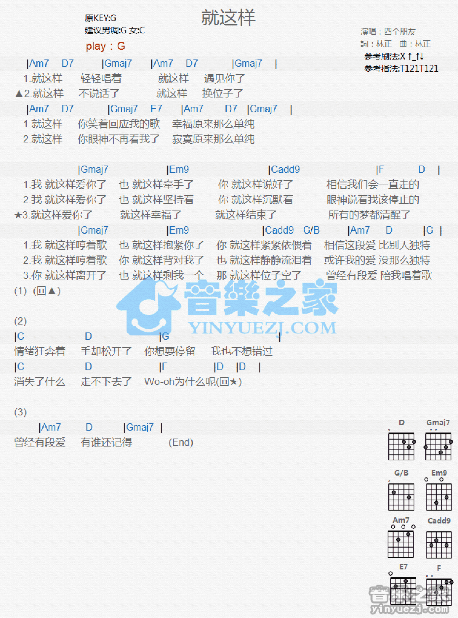 曲谱介绍: G调版 四个朋友《就这样》吉他和弦弹唱谱
