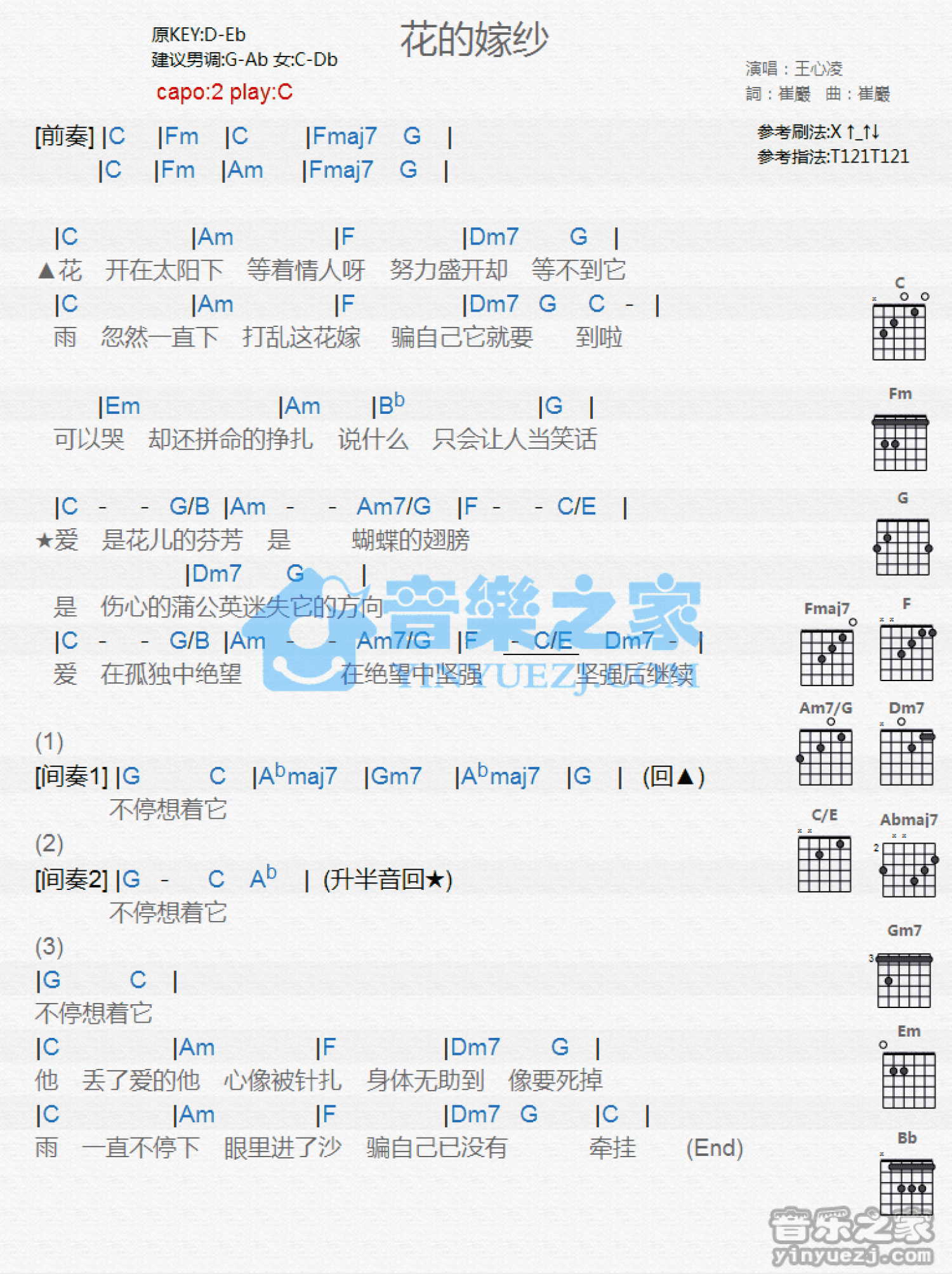 曲谱介绍: C调版 王心凌《花的嫁纱》吉他和弦弹唱谱