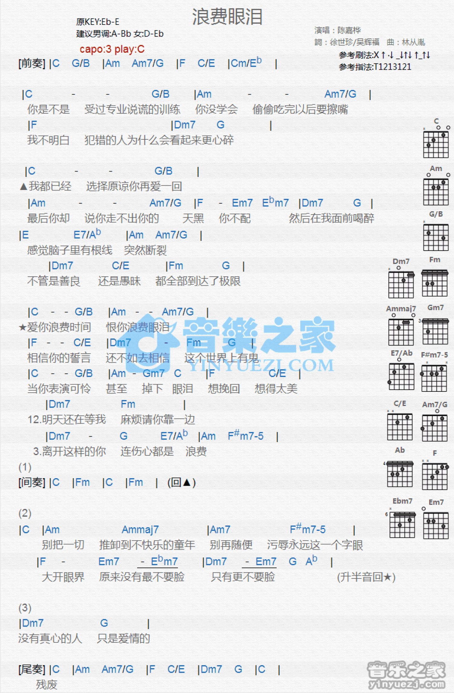 浪费眼泪吉他谱 - 陈嘉桦 - C调吉他弹唱谱 - 和弦谱