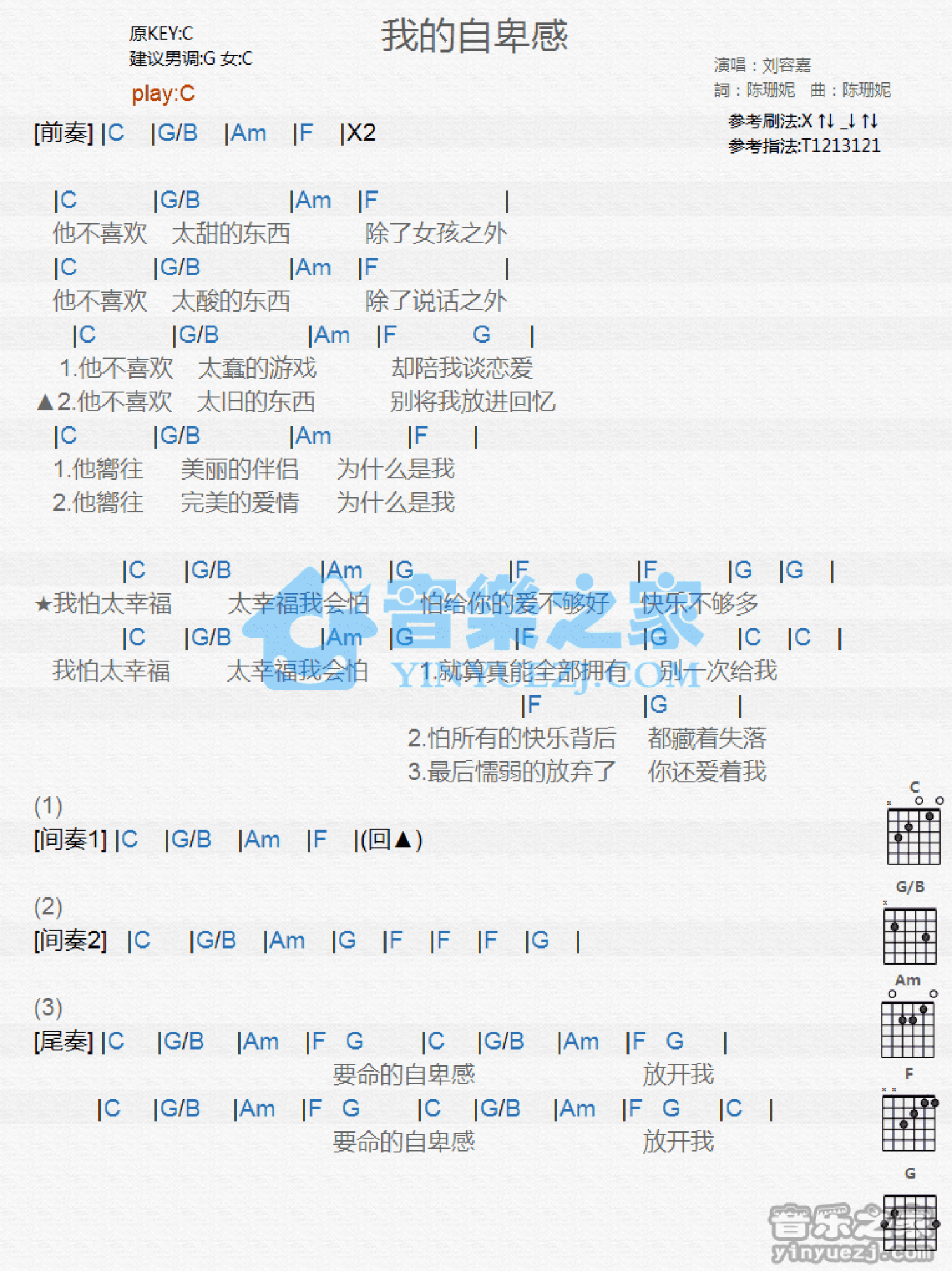 曲谱介绍: C调版 刘容嘉《我的自卑感》吉他和弦弹唱谱