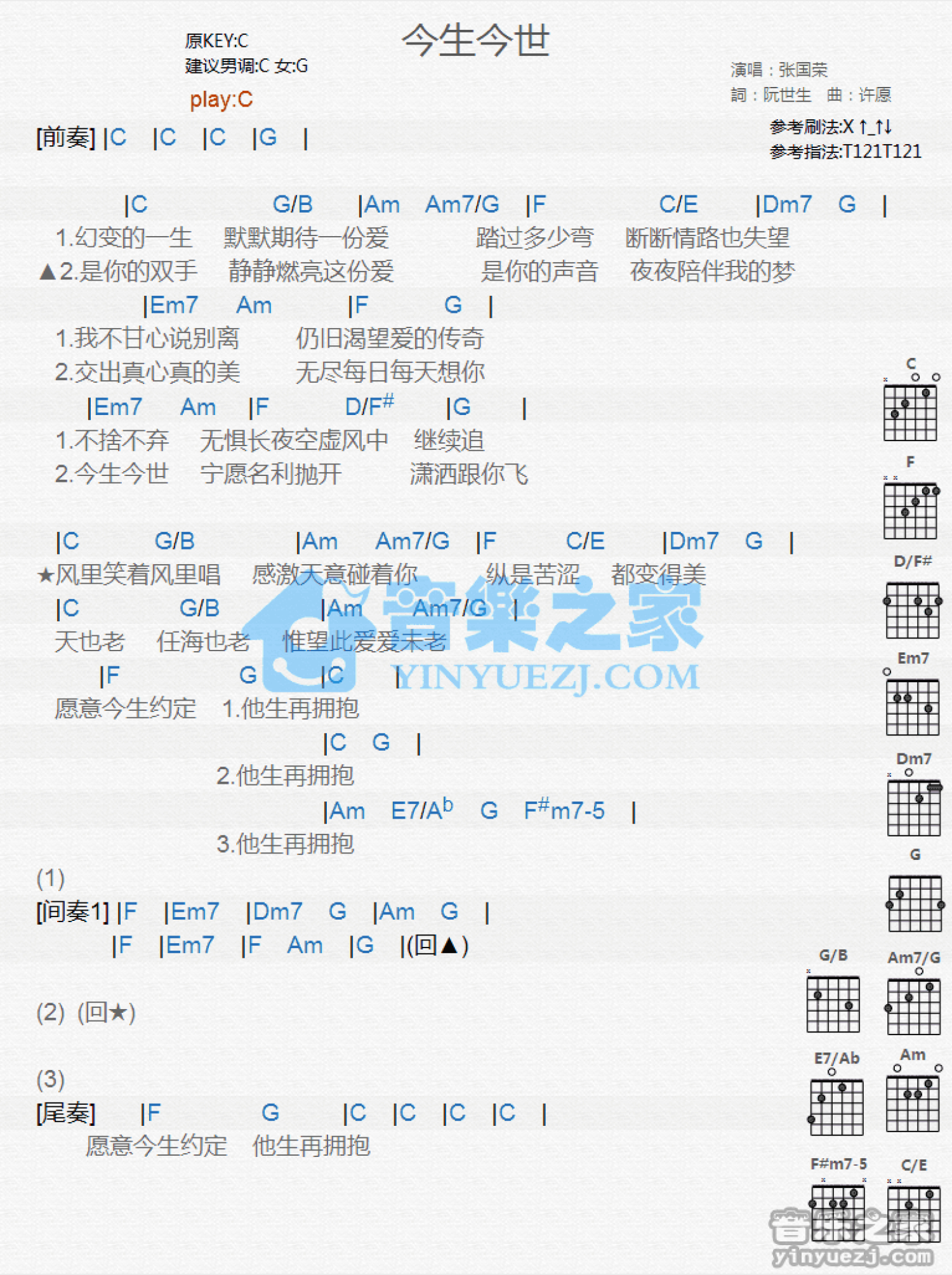曲谱介绍: C调版 张国荣《今生今世》吉他和弦弹唱谱