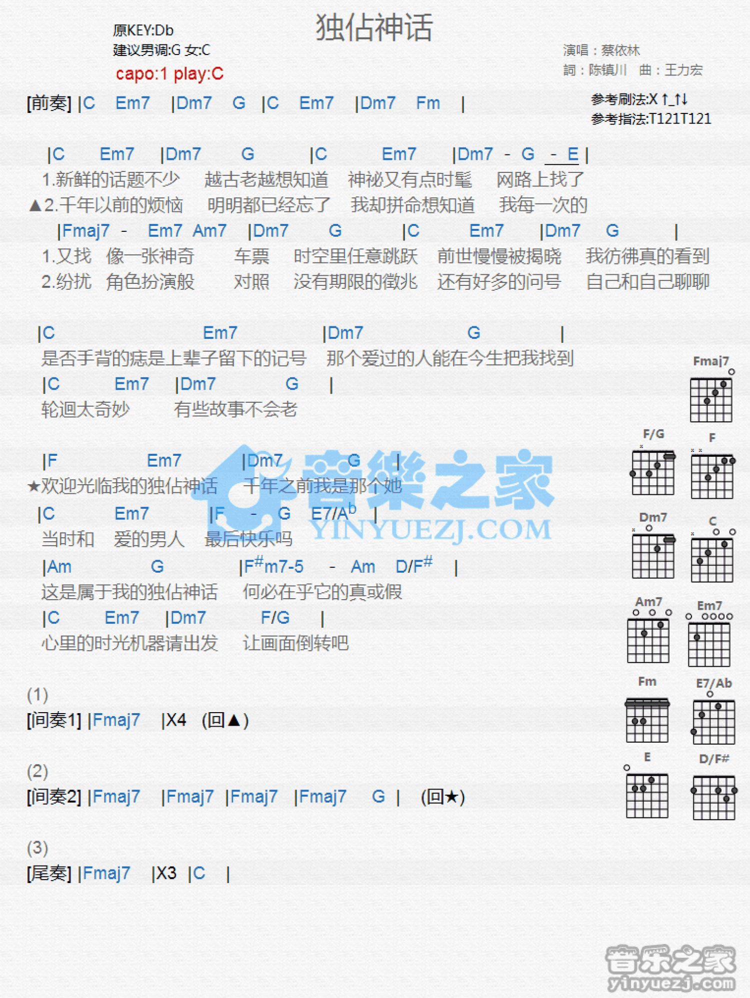 曲谱介绍: C调版 蔡依林《独占神话》吉他和弦弹唱谱