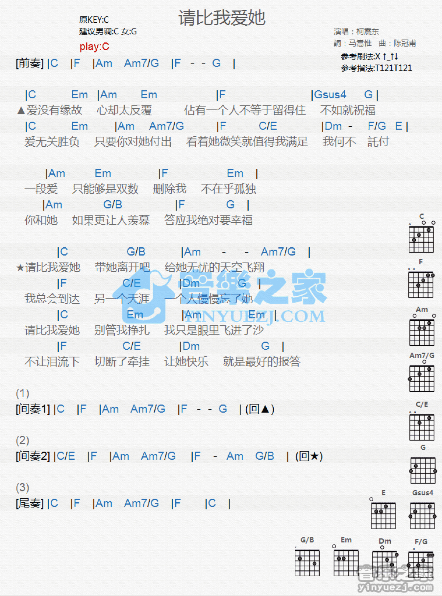 曲谱介绍: C调版 柯震东《请比我爱她》吉他和弦弹唱谱