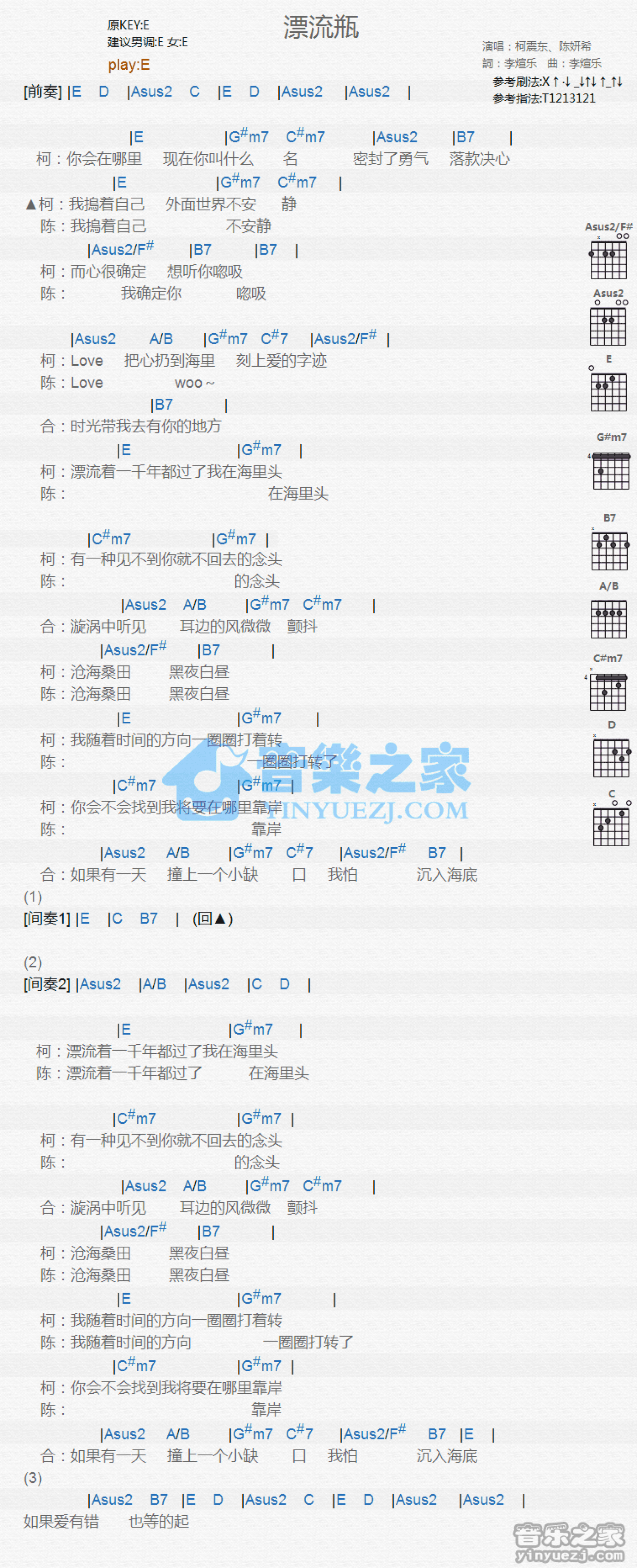曲谱介绍: E调版 柯震东/陈妍希《漂流瓶》吉他和弦弹唱谱