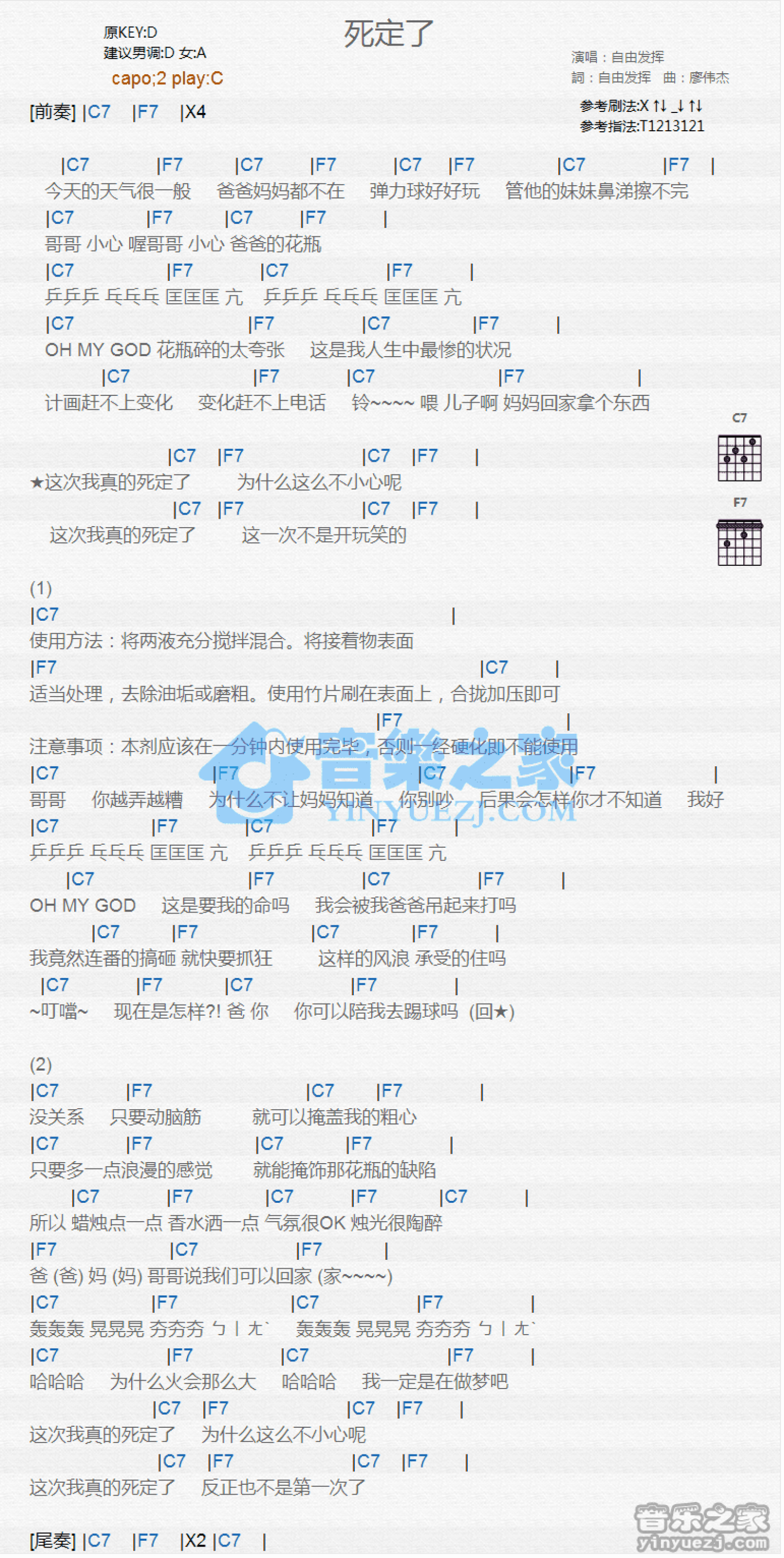 曲谱介绍: C调版 自由发挥《死定了》吉他和弦弹唱谱