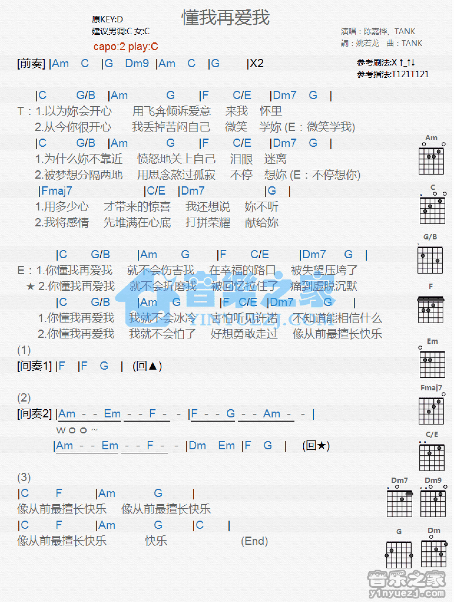 曲谱介绍: C调版陈嘉桦/TANK《懂我再爱我》吉他和弦弹唱谱