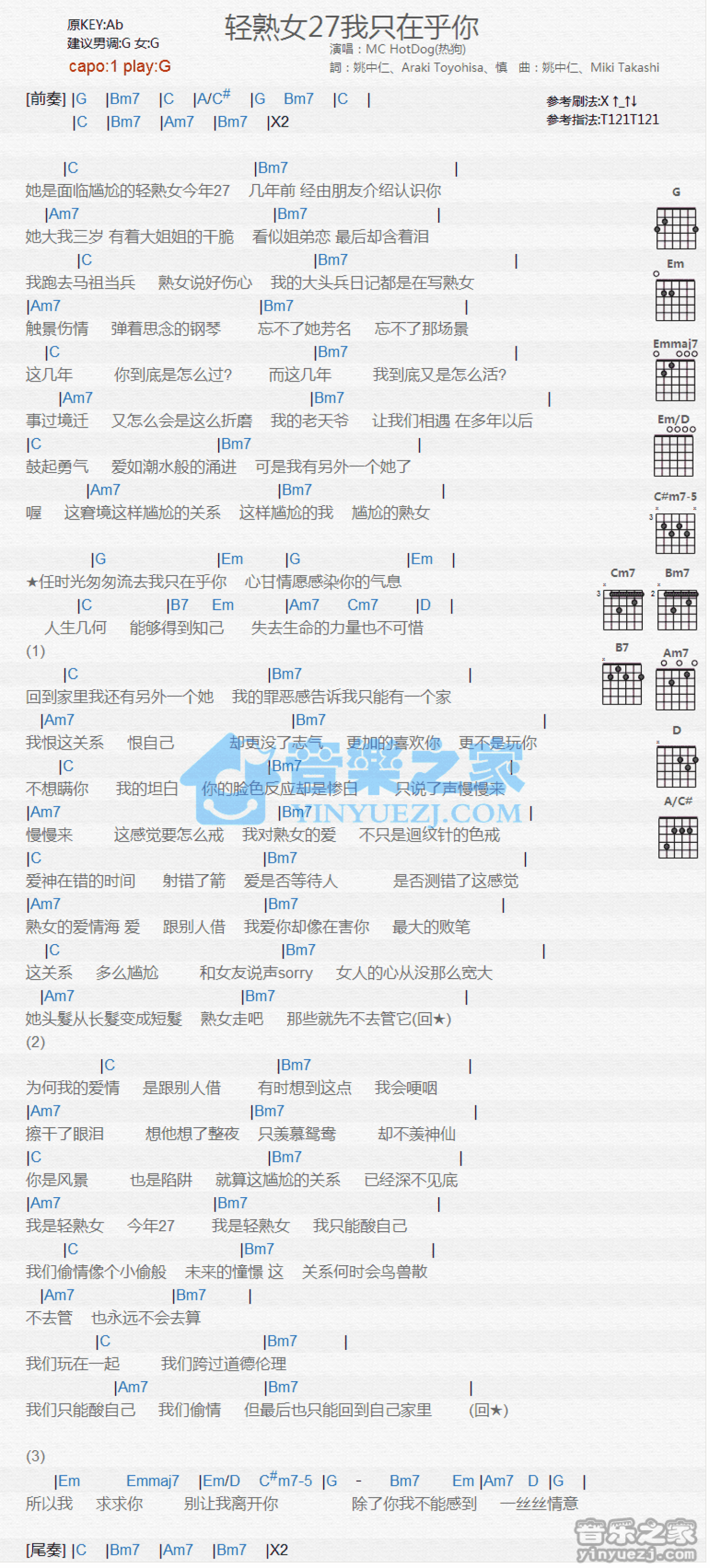 曲谱介绍: G调版 MC HotDog《轻熟女27》吉他和弦弹唱谱
