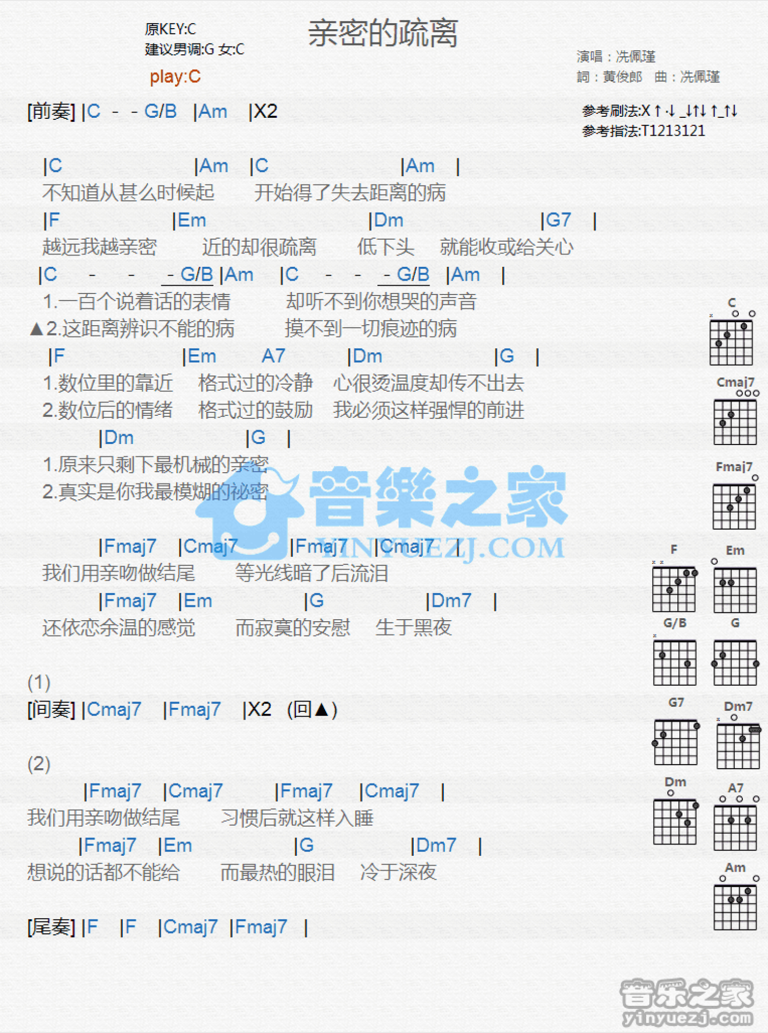 曲谱介绍: C调版 冼佩瑾《亲密的疏离》吉他和弦弹唱谱
