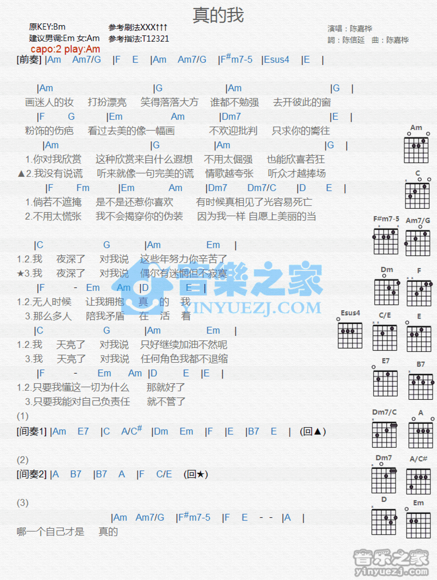 曲谱介绍: Am调版 陈嘉桦《真的我》吉他和弦弹唱谱