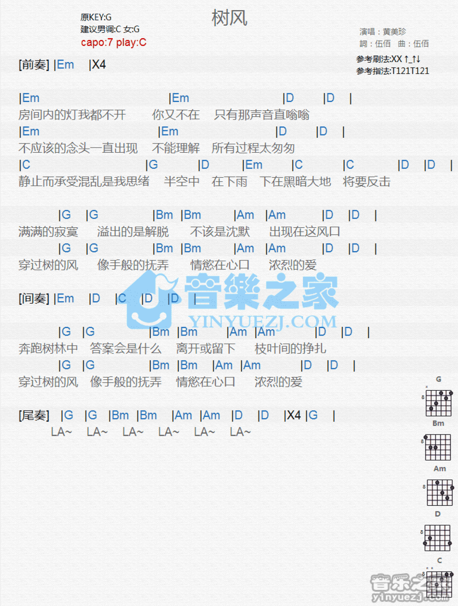 曲谱介绍: C调版 黄美珍《树风》吉他和弦弹唱谱