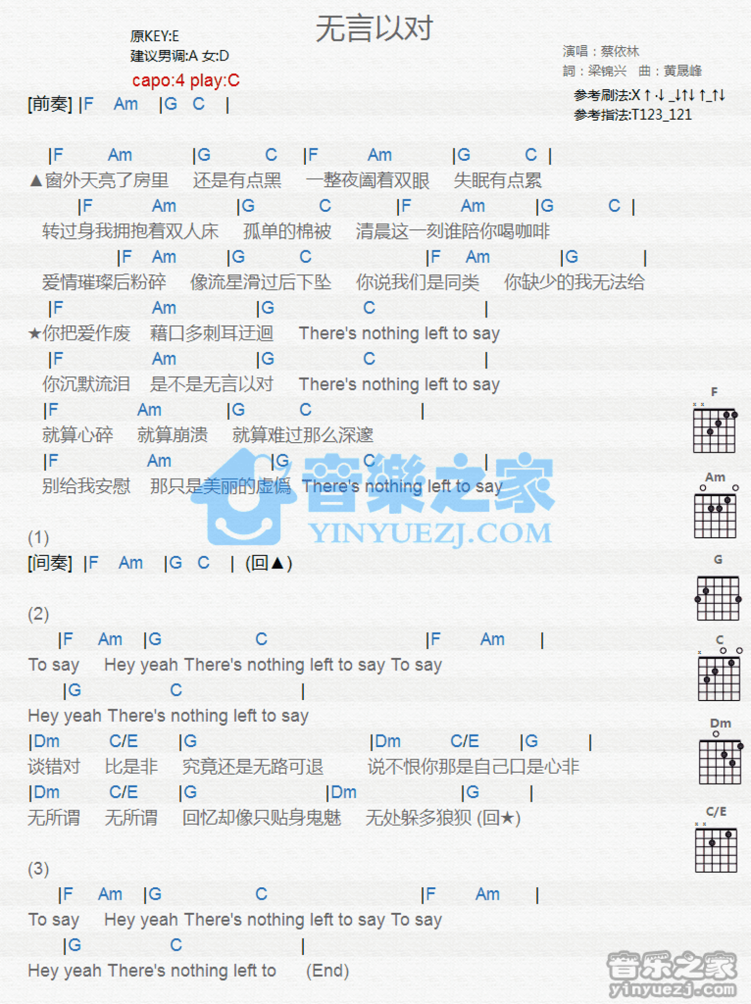 曲谱介绍: C调版蔡依林《无言以对》吉他和弦弹唱谱