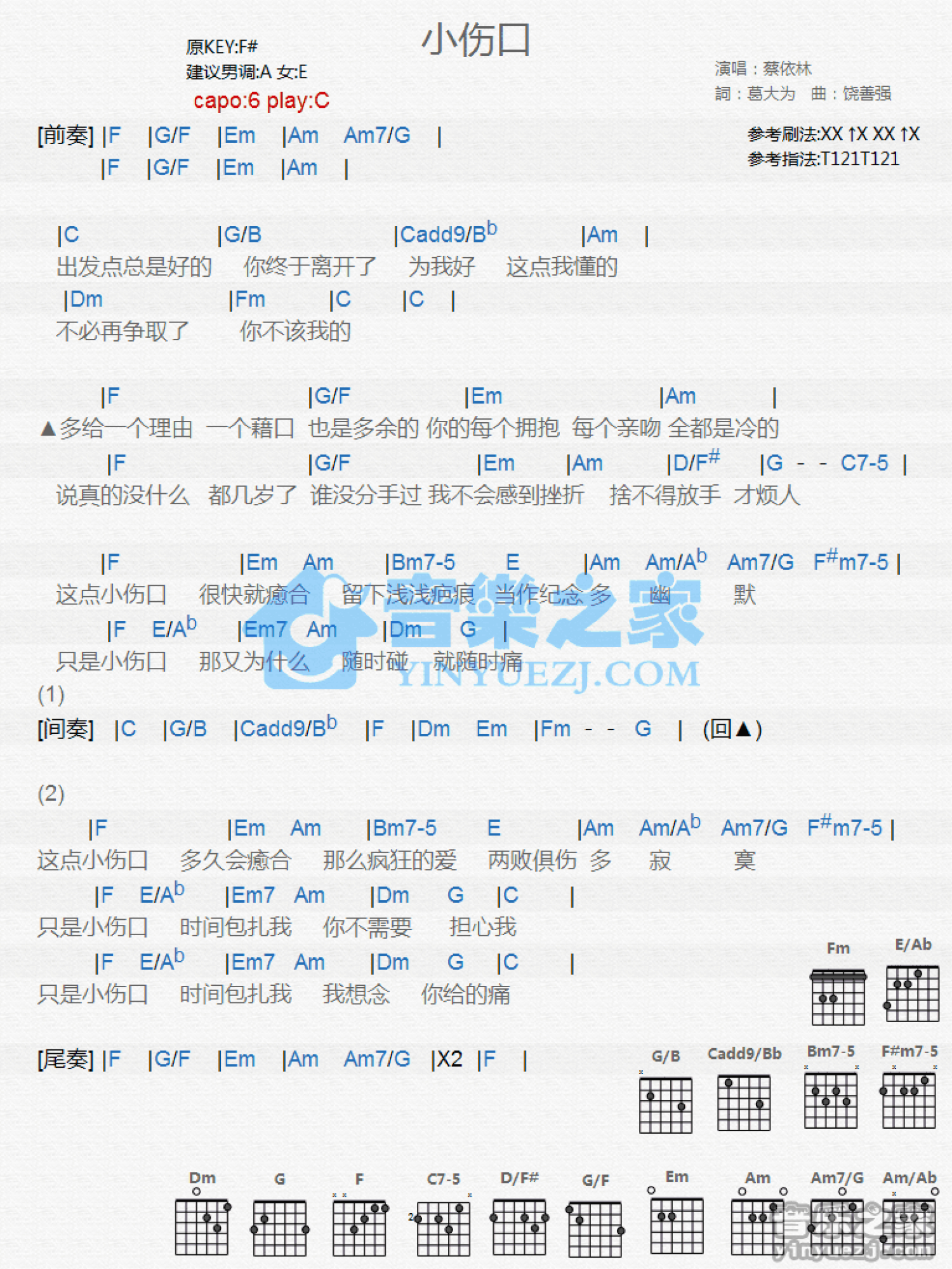 曲谱介绍: C调版蔡依林《小伤口》吉他和弦弹唱谱
